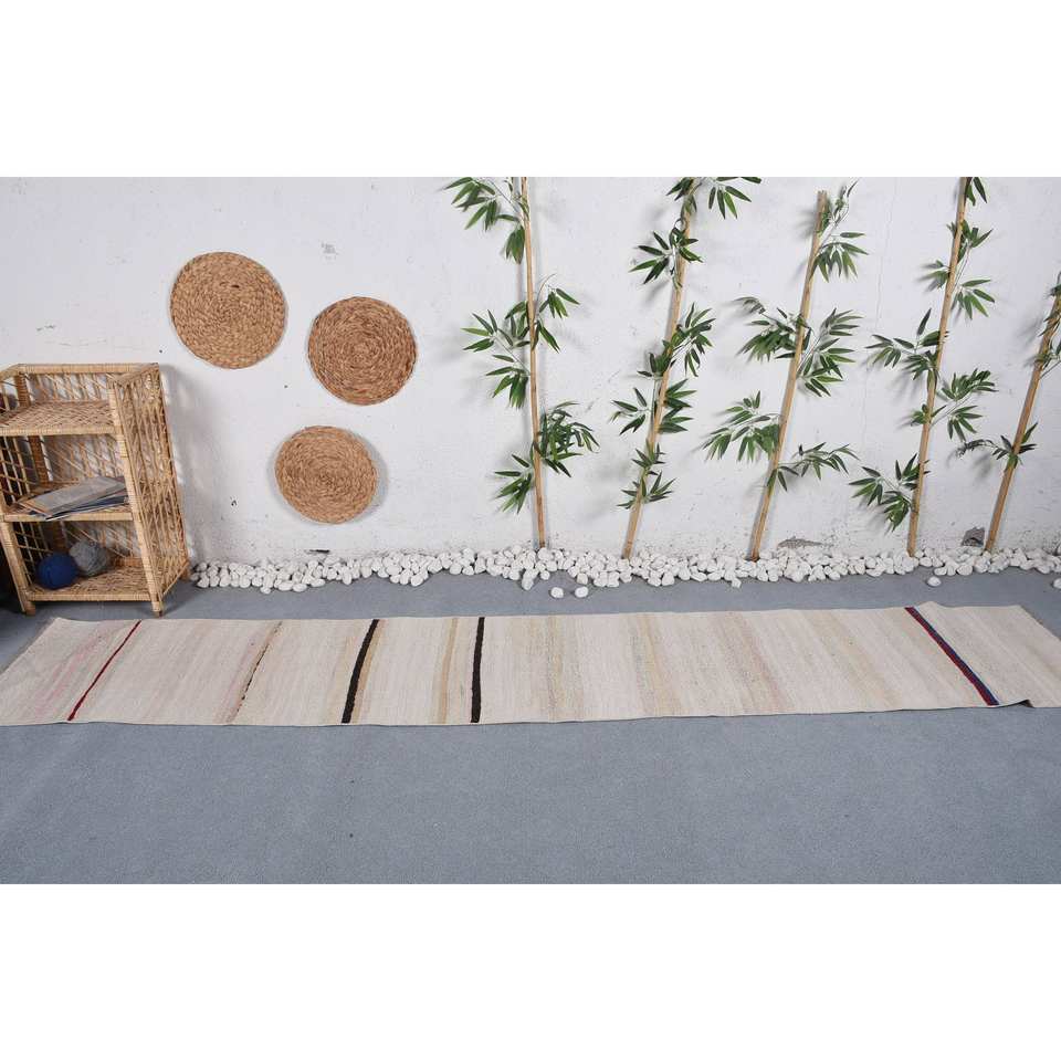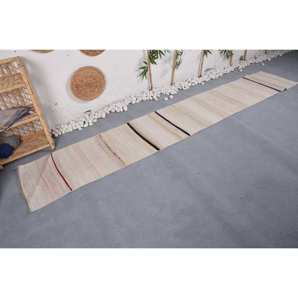 Minimalist Classic Vintage Turkish Rug Beige Striped Patchwork Design 9x12 Rectangle Wool Material Latex Backing for Teen Living