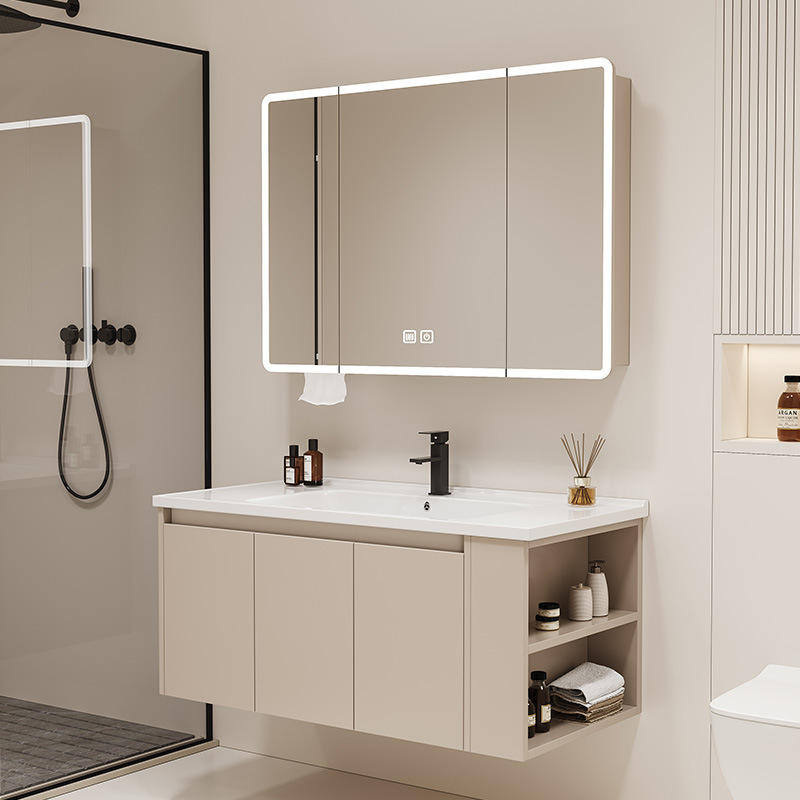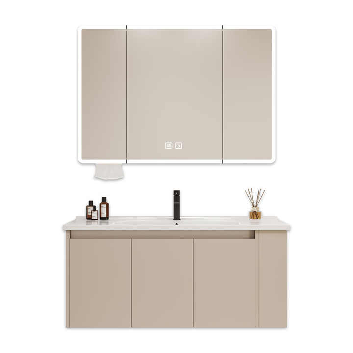 ตู้ห้องน้ำสไตล์มินิมอลสีครีม พร้อมตู้กระจกอัจฉริยะป้องกันฝ้า ตู้ข้าง และอ่างเซรามิกในตัว