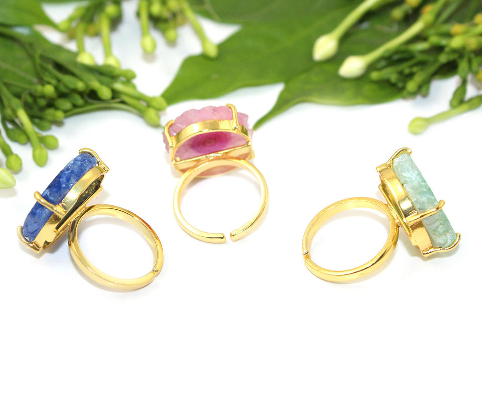แหวนพลอยควอตซ์พลังงานแสงอาทิตย์แบบมินิมอลสีชมพูชุบทอง24K สำหรับผู้หญิง