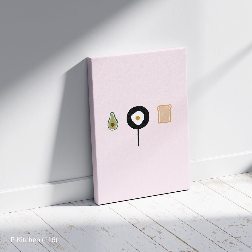 ศิลปะบนผืนผ้าใบสำหรับห้องครัวสไตล์มินิมอล องค์ประกอบอาหารเช้า ภาพประกอบสีพาสเทลน่ารัก ธีมกาแฟและอาหารว่างยามเช้า