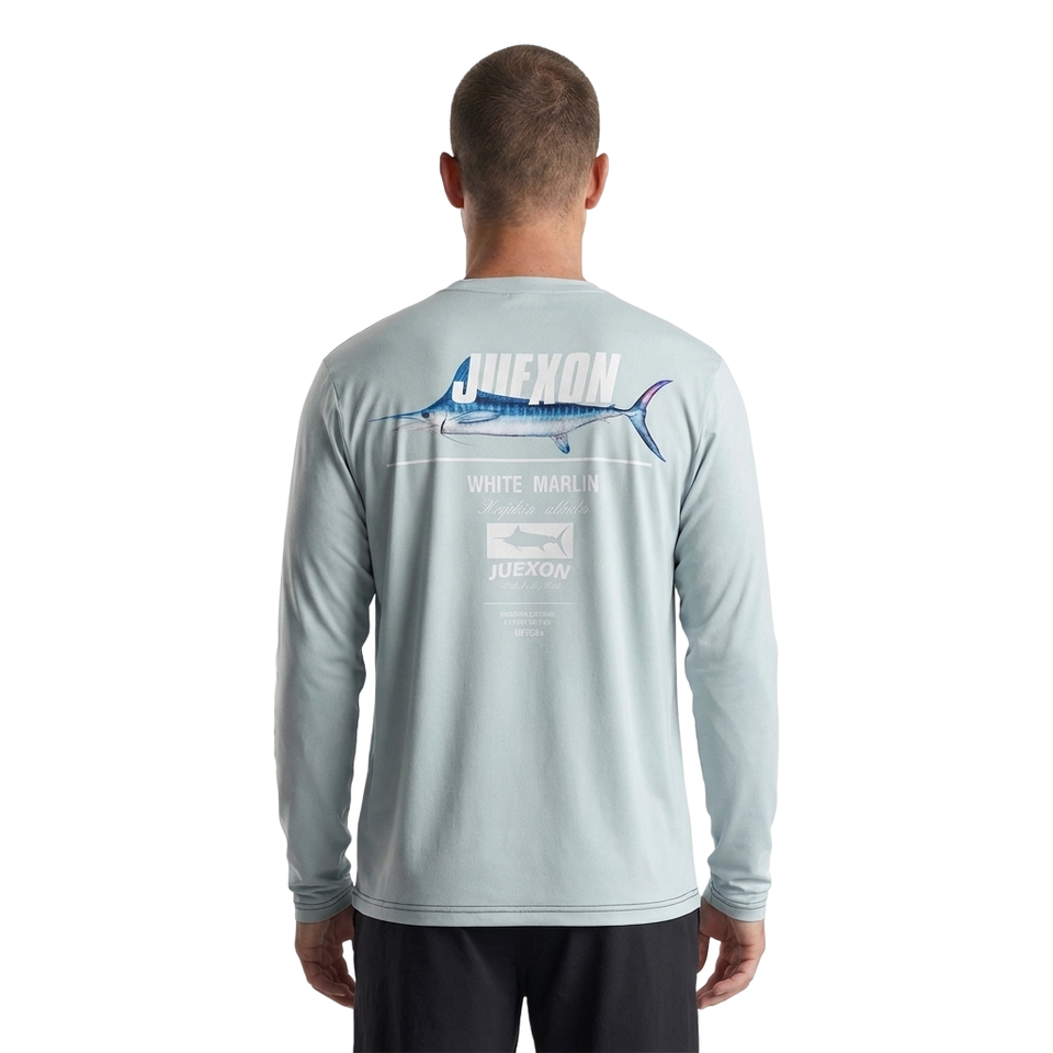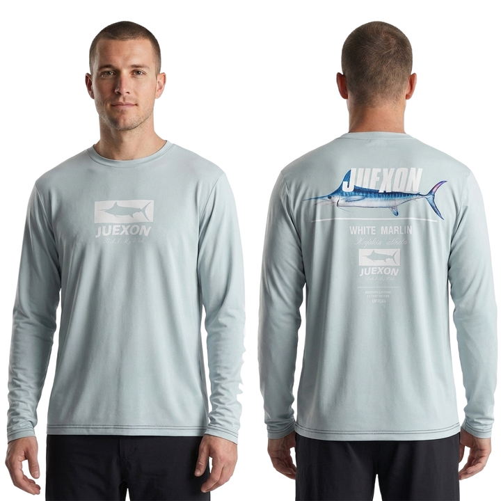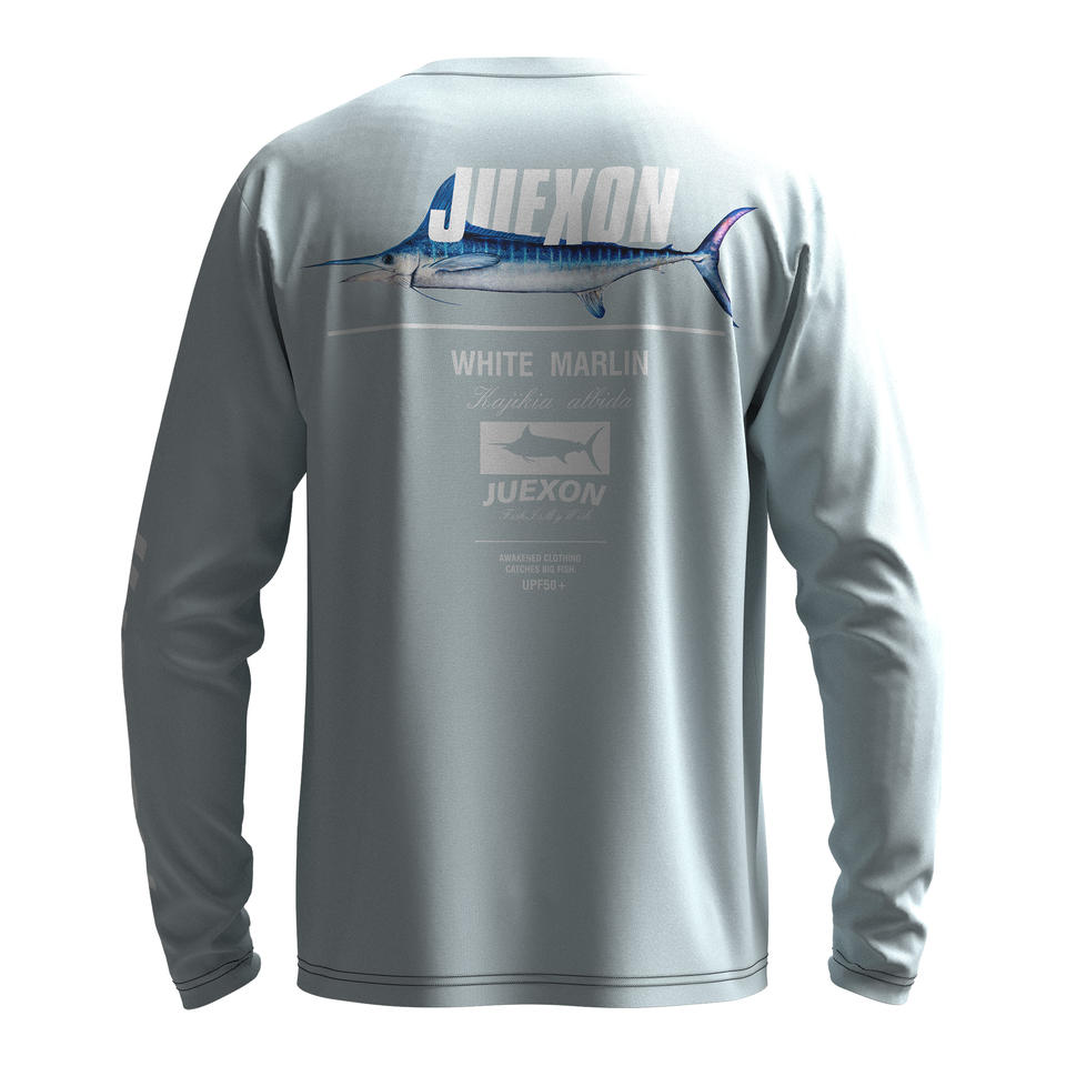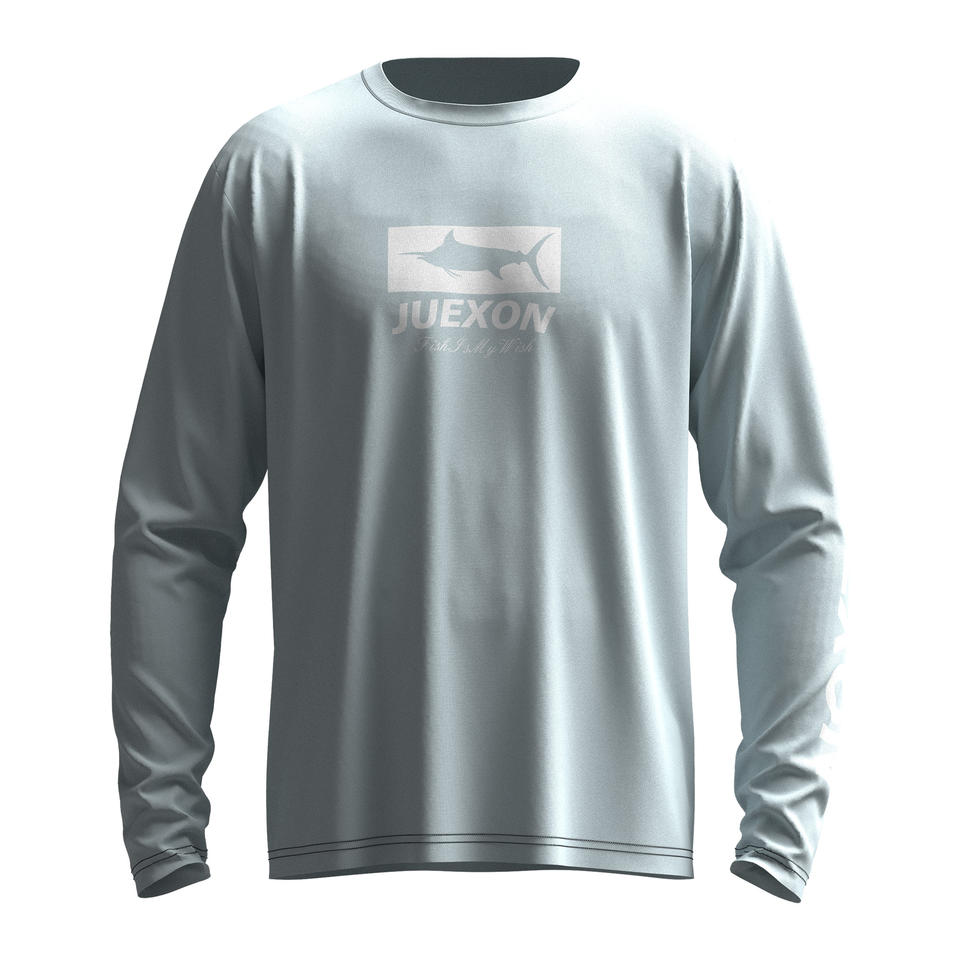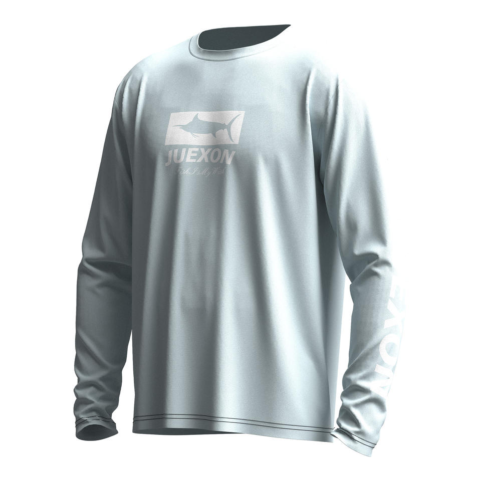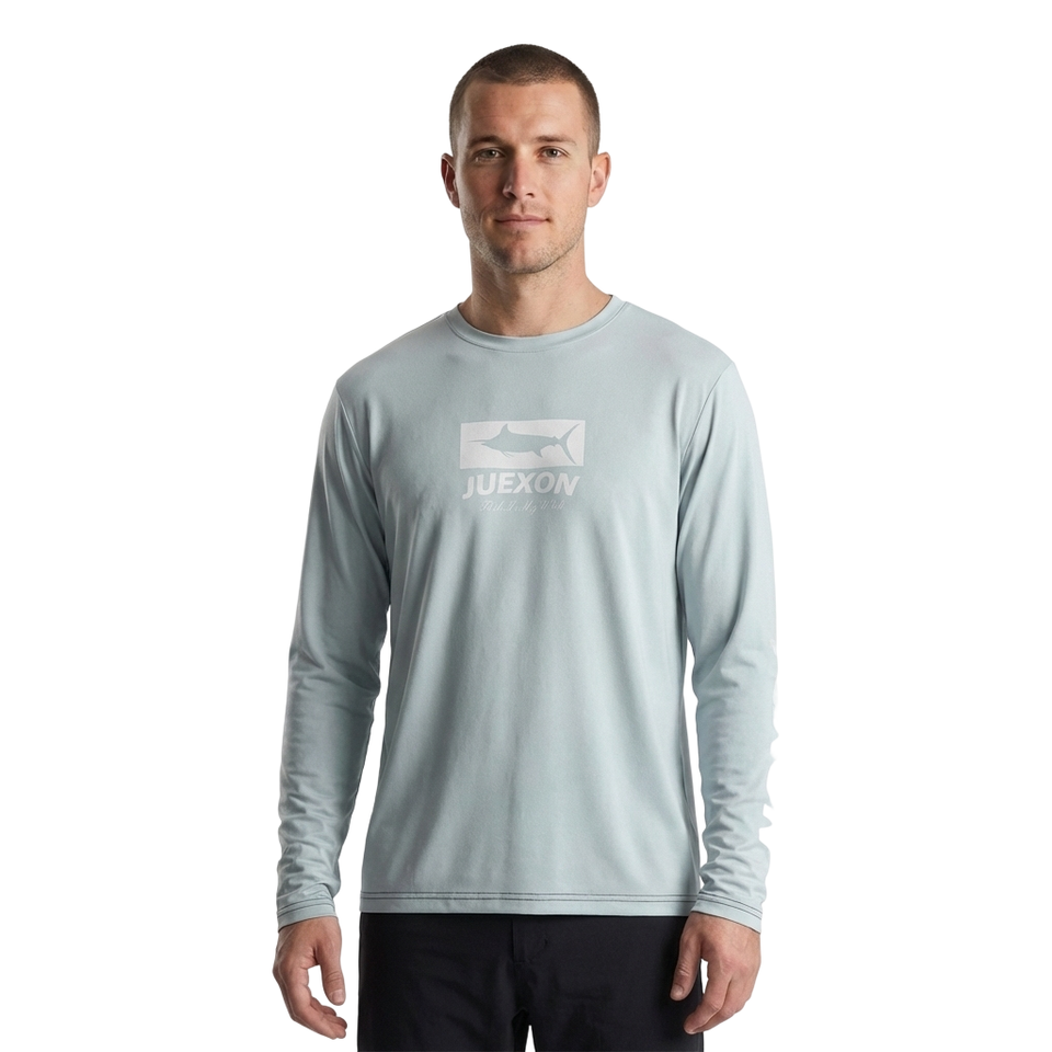 เสื้อตกปลาพิมพ์ลายพรางกันน้ำสีเทาอ่อนสไตล์มินิมอล แห้งเร็ว น้ำหนักเบา UPF50 สำหรับผู้ชาย แขนยาว
