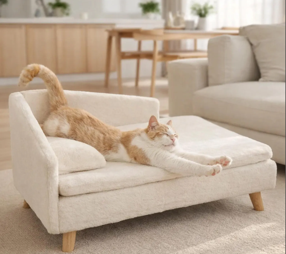 เตียงแมวและสุนัขแบบมินิมอลทันสมัยสำหรับใช้ในบ้าน ทำจากเมมโมรี่โฟมบุผ้ากำมะหยี่ ขาไม้แบบพกพา ใช้ได้ทั้งห้องนั่งเล่นและห้องนอน บรรจุในกล่อง