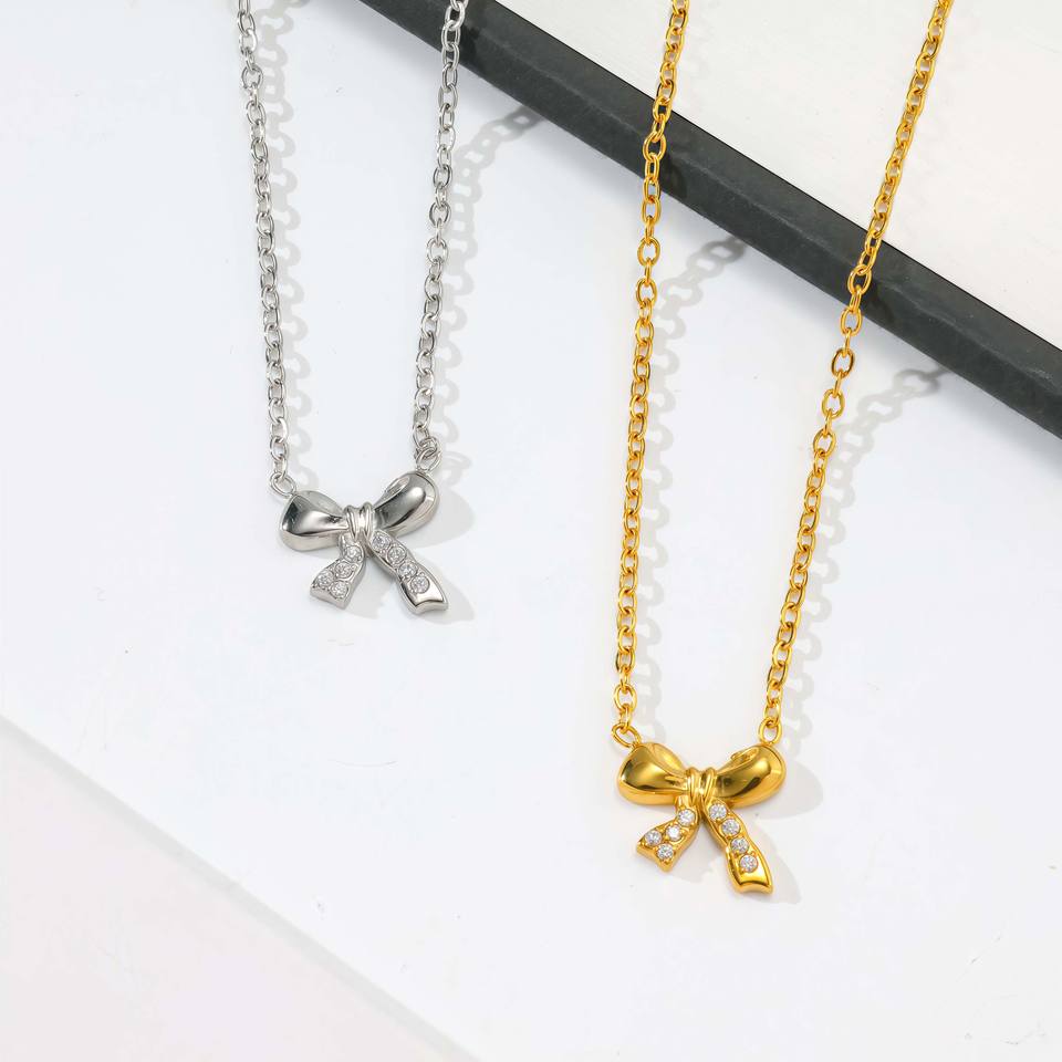 สร้อยคอแบบมินิมอล ดีไซน์โบว์เล็กๆ สายไม้ไผ่ สแตนเลสประดับเพชรซิคอน สร้อยคอแฟชั่น สไตล์ทันสมัย ใช้ได้ทุกวัน เครื่องประดับอเนกประสงค์