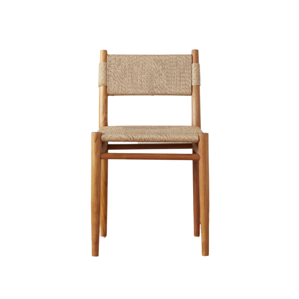 เก้าอี้รับประทานอาหารกลางแจ้งแบบมินิมอลพร้อมพนักพิงและที่นั่งเชือกหวายสาน