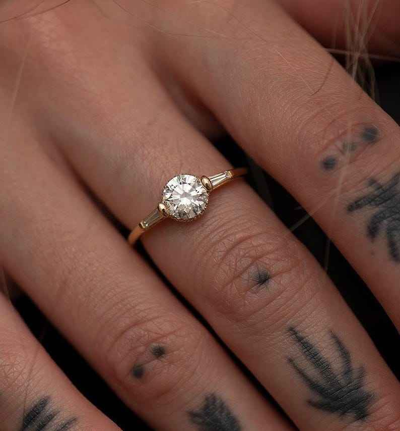 Minimalist Round Cut Moissanite Halo Ring With Matching Band 14K Solid Gold Wedding Ring Set Vintage Style Dainty Bridal Set