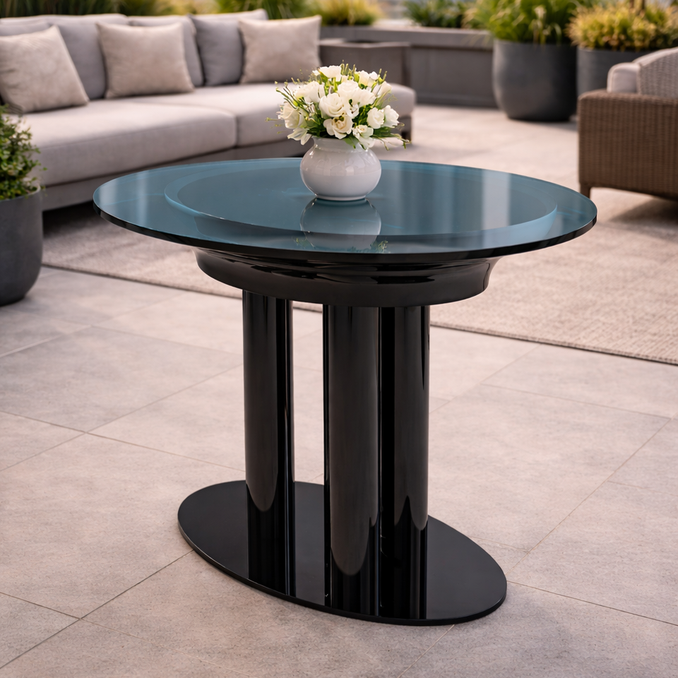 โต๊ะข้างทรงกลมสไตล์มินิมอลที่ทนทาน พร้อมฐานโลหะสีดำเรียบหรู และท็อปโลหะสีน้ำเงินสวยงาม สำหรับเฟอร์นิเจอร์ห้องนั่งเล่นทันสมัย