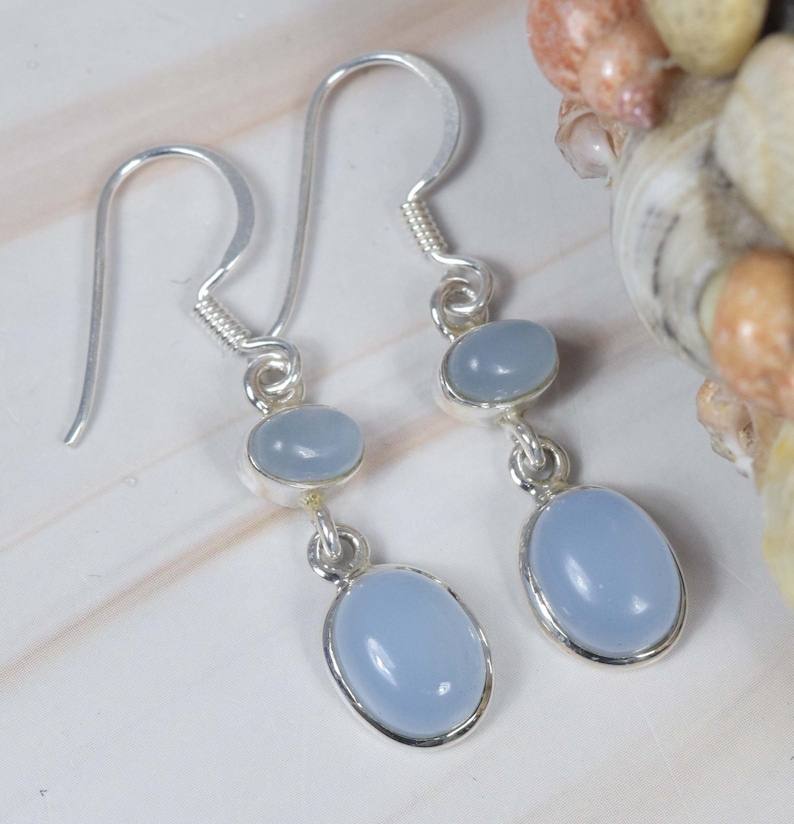 925ทึบแบบมินิมอลสเตอร์ลิงเงินคู่สีฟ้าพลอยคาลซิโดนีทรงรีแบบตะขอเกี่ยว2ชิ้นต่างหูหินสวยงาม