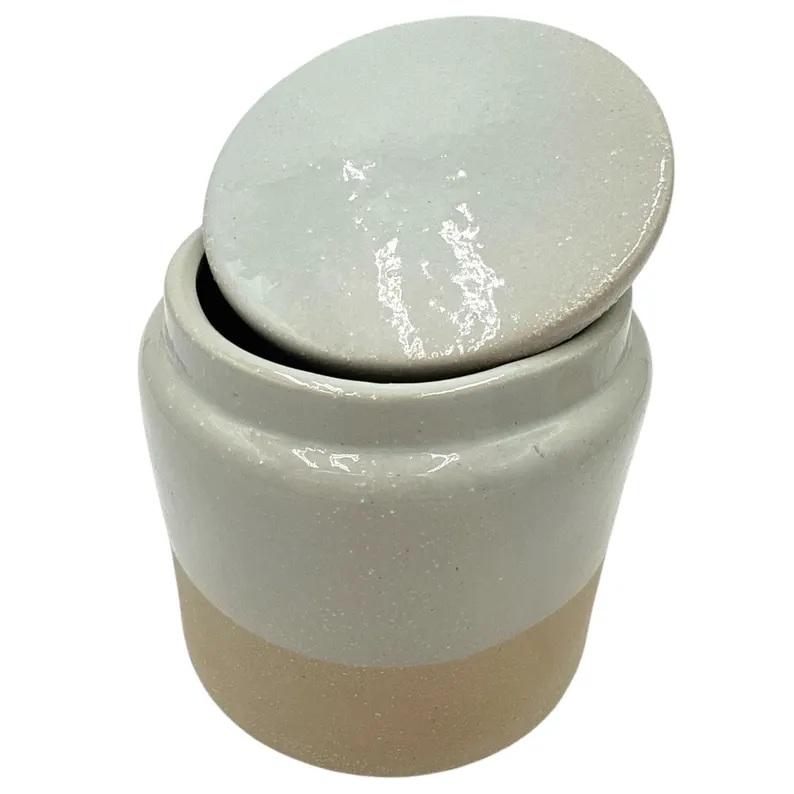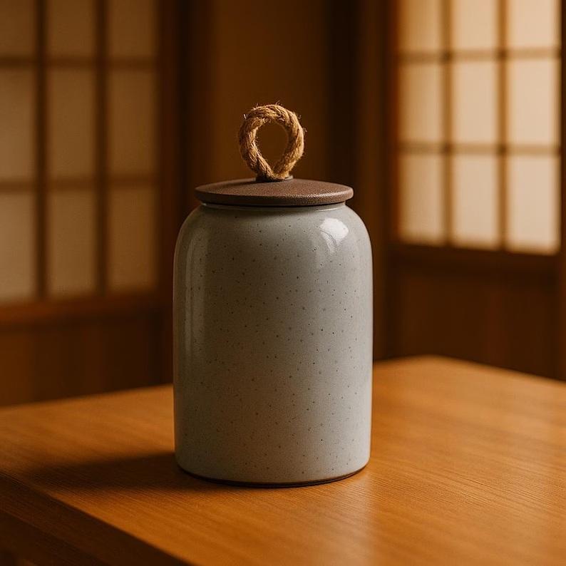 Minimalist Speckled Storage Jar With Rope Handle Lid Smooth Glazed Finish Decorative Countertop Organizer Elegant Pantry Keeper