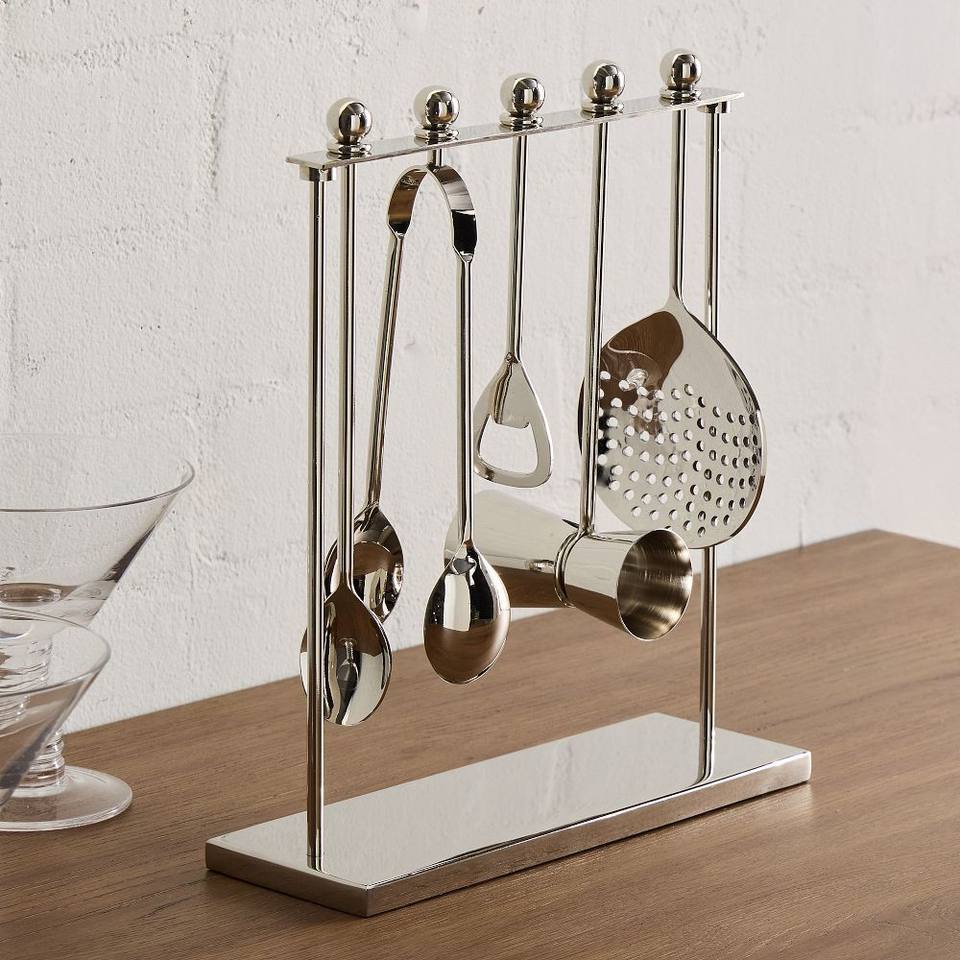 ชุดเครื่องมือบาร์สแตนเลสแบบมินิมอลพร้อมขาตั้ง อุปกรณ์ทำค็อกเทลระดับมืออาชีพ ทนทาน ทันสมัย สำหรับบาร์ในบ้าน
