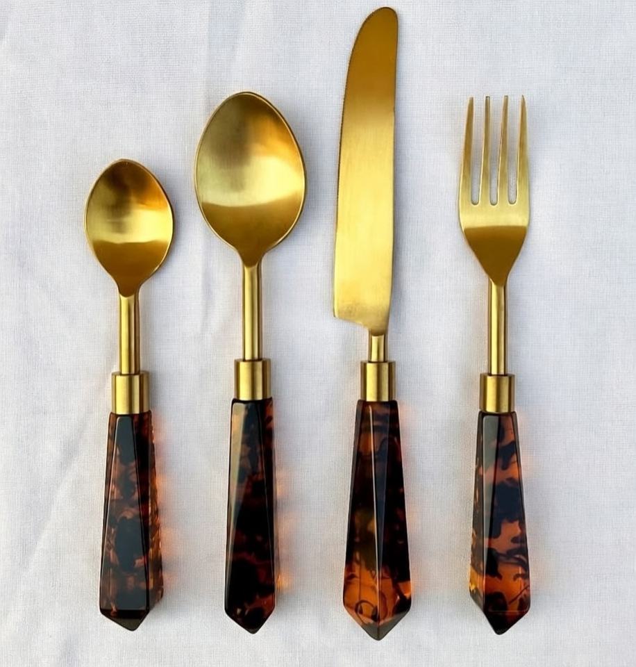 ชุดช้อนส้อมสแตนเลสสตีลแบบมินิมอล พร้อมด้ามจับเรซิ่นลายกระดองเต่า และช้อนและส้อมเคลือบ PVD สีทอง ชุดอุปกรณ์บนโต๊ะอาหาร ราคาสุดคุ้ม