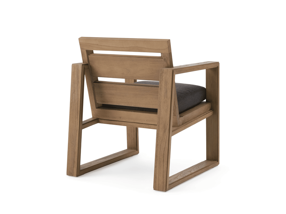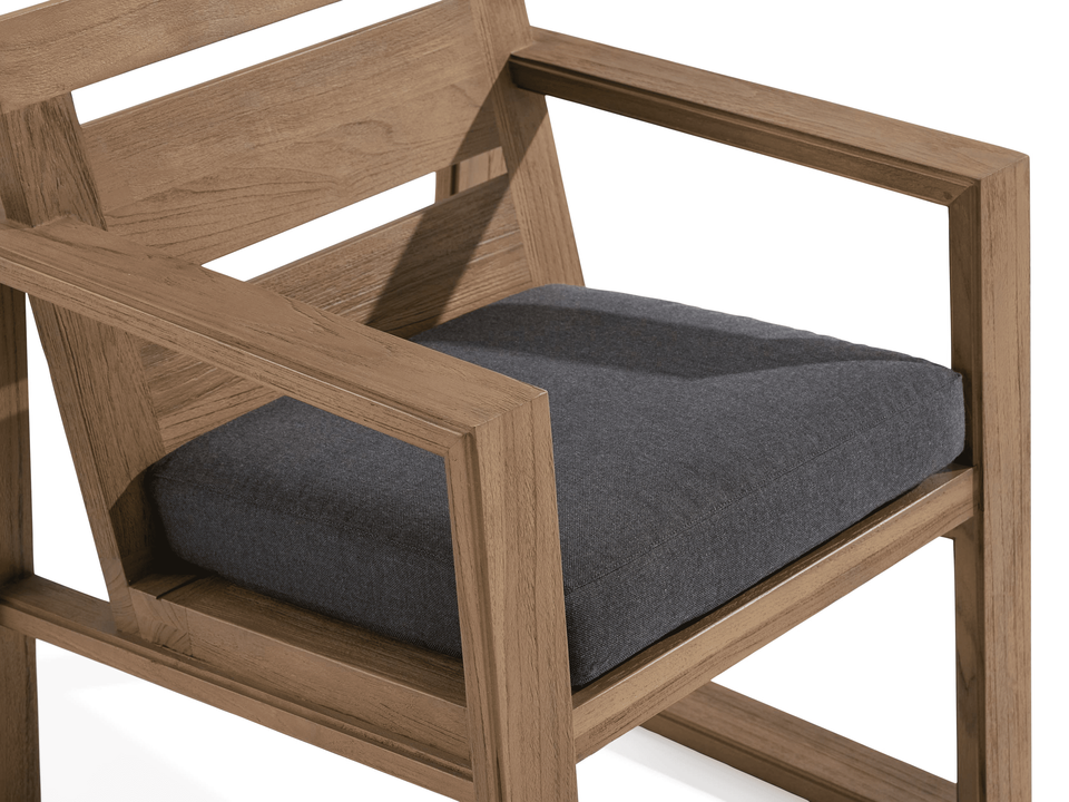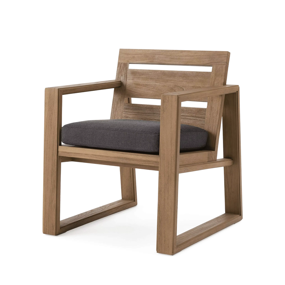 เก้าอี้ไม้สักเรียบง่ายทันสมัยทนทานสำหรับรับประทานอาหารกลางแจ้งพร้อมเบาะรองนั่งสีเทาสำหรับวิลล่า