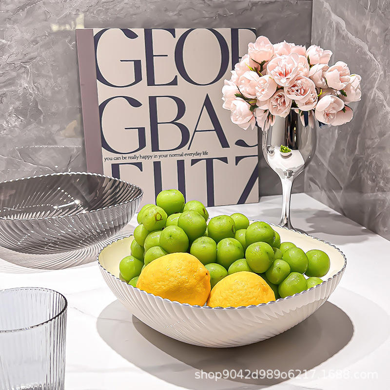 จานผลไม้พลาสติกใสสไตล์มินิมอลสำหรับห้องนั่งเล่นในบ้าน ถาดเสิร์ฟ ปลอดภัยสำหรับเครื่องล้างจาน ดีไซน์สีพื้น