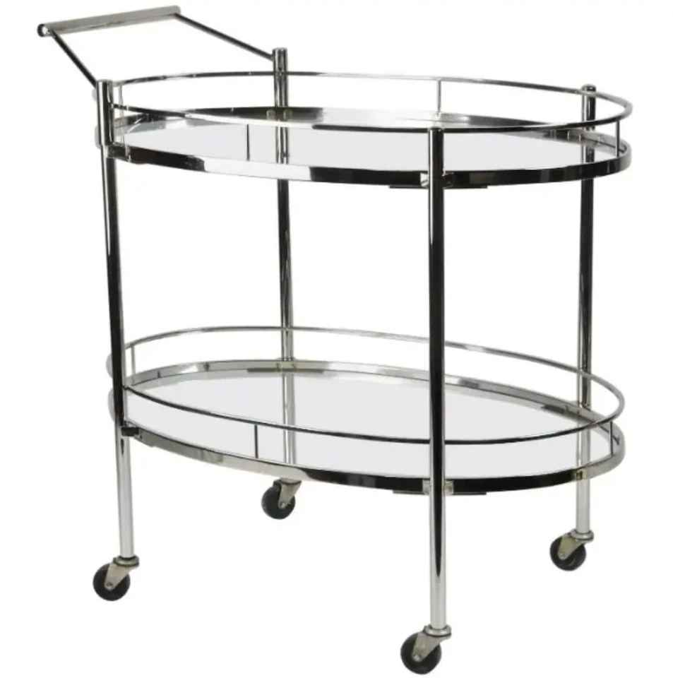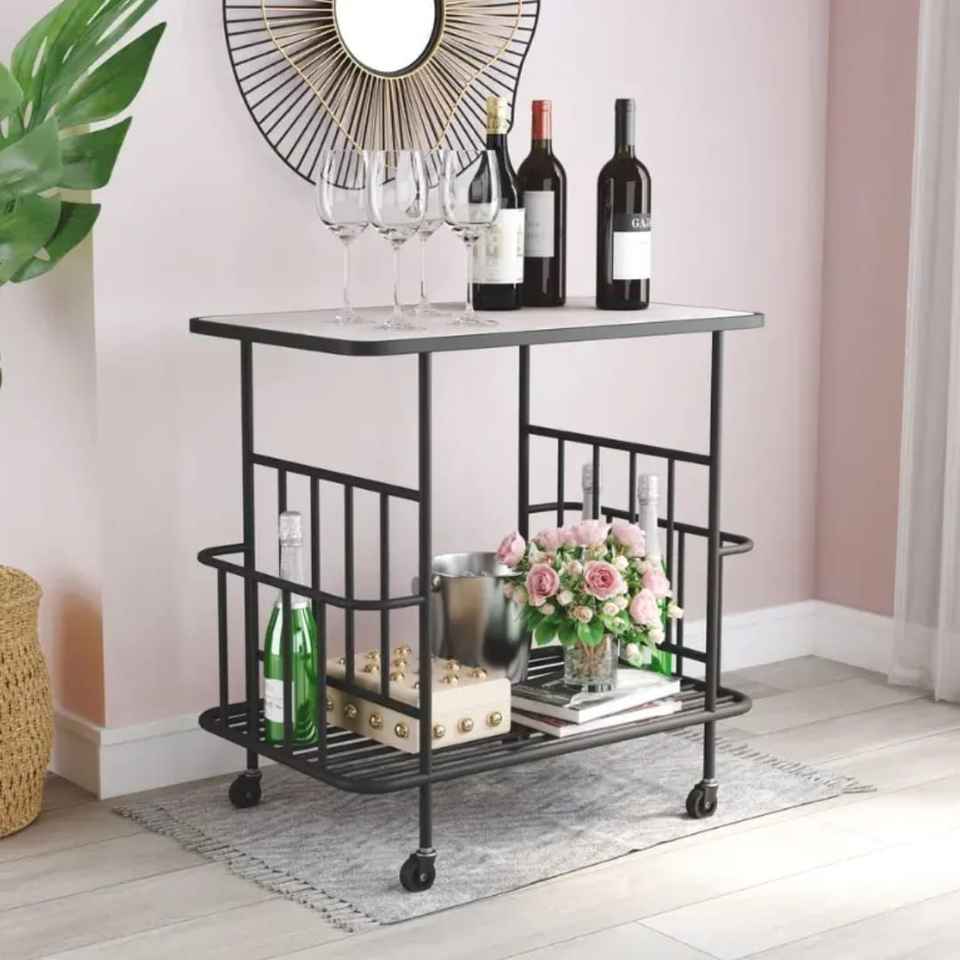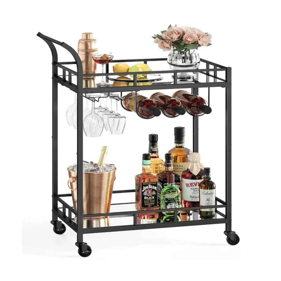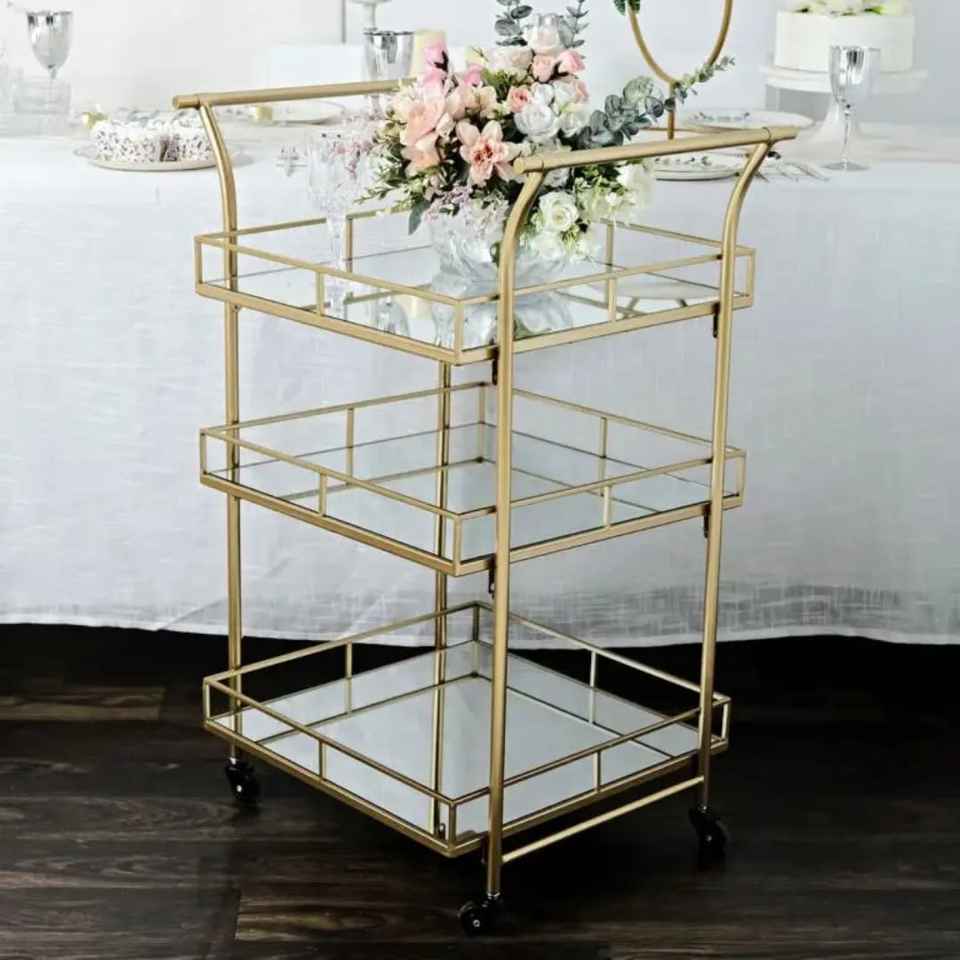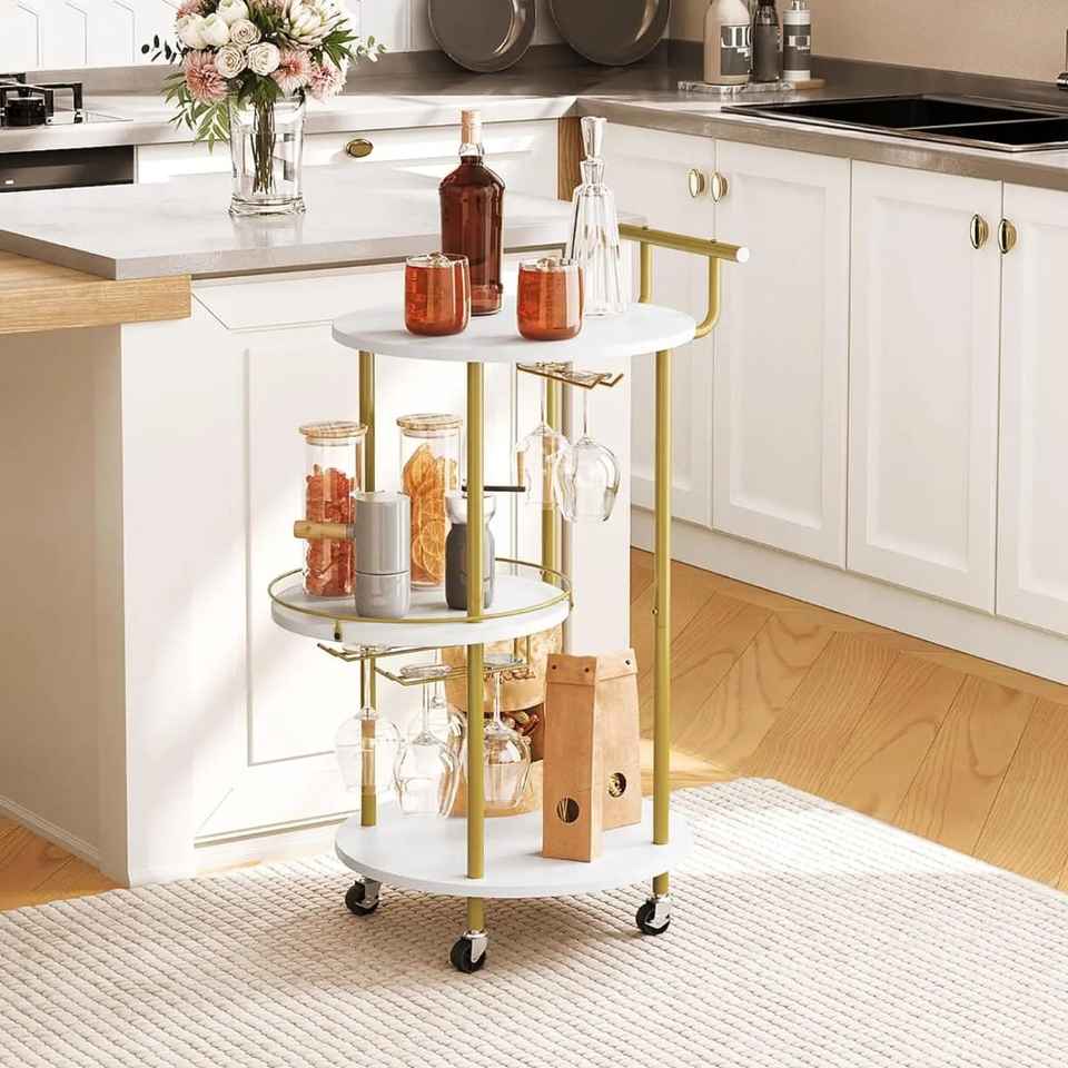 รถเข็นบาร์ทรงกลมสีขาวสไตล์มินิมอล 3 ชั้น โครงโลหะสีทอง รถเข็นเสิร์ฟเคลื่อนที่ สถานีเครื่องดื่มเคลื่อนที่ รถเข็นกาแฟสำหรับพื้นที่ขนาดเล็ก