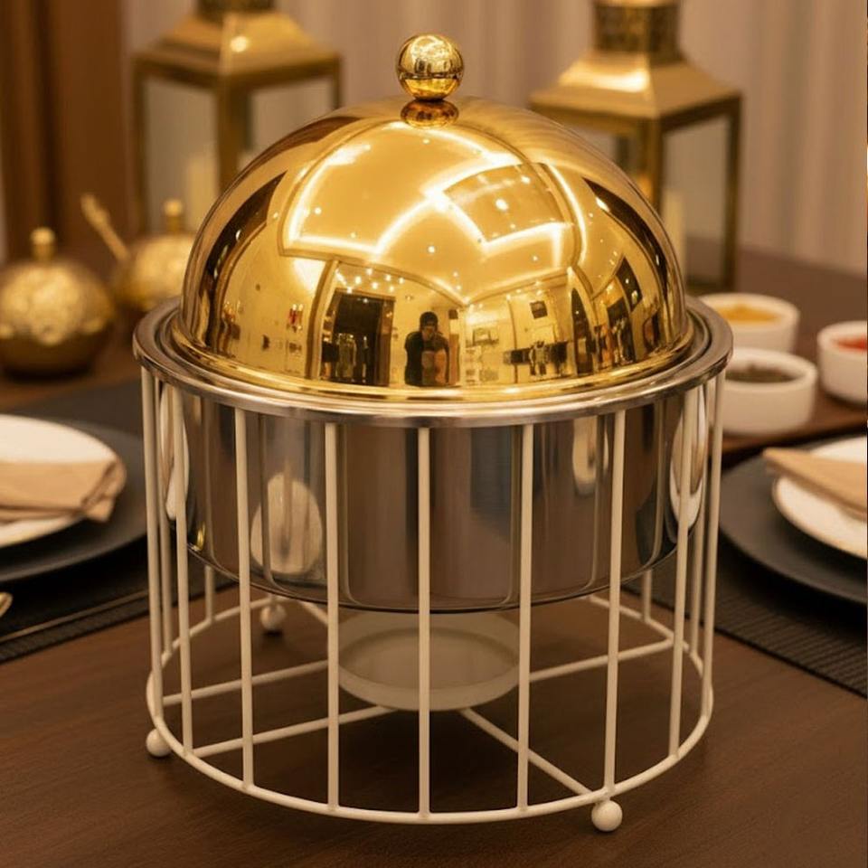 ถาดอุ่นอาหารสแตนเลสทรงมินิมอลพร้อมฝาครอบทรงโดมและที่วางเทียนสำหรับการรับประทานอาหารสมัยใหม่และการใช้งานบุฟเฟ่ต์