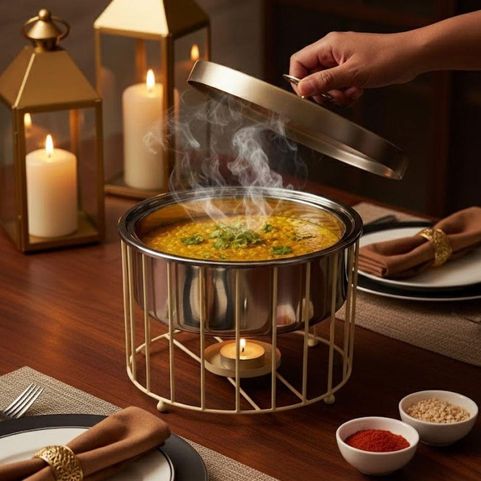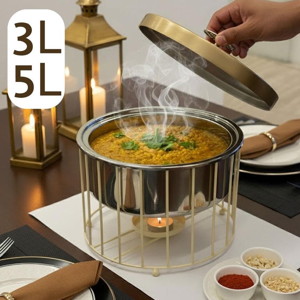 ถาดอุ่นอาหารสแตนเลสแบบมินิมอลพร้อมฝาสีทองและที่วางเทียนสำหรับการรับประทานอาหารสมัยใหม่และการใช้งานบุฟเฟ่ต์
