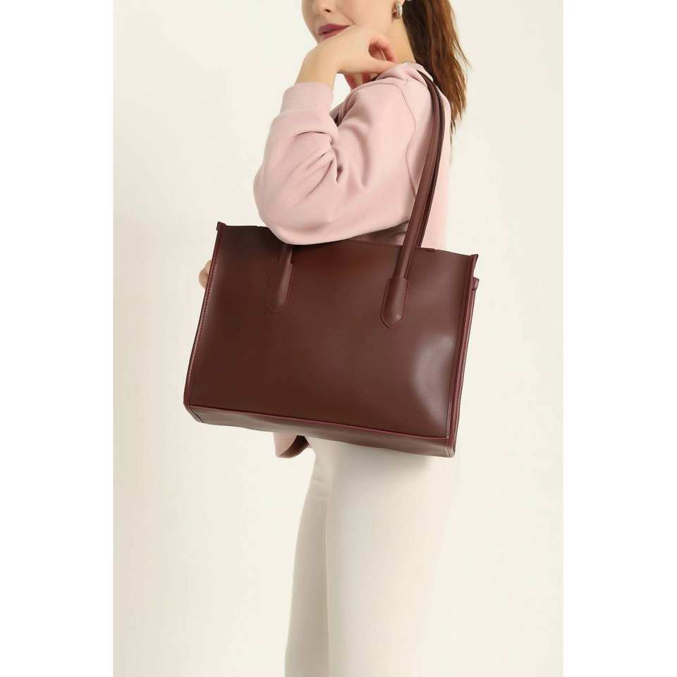 กระเป๋าสะพายไหล่สตรีสไตล์มินิมอล หูหิ้วสองข้าง ทรงเปิดด้านบน หนังสีน้ำตาล