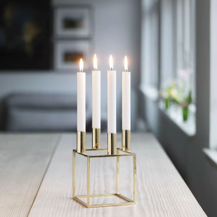 ที่วางเทียนทรงลูกบาศก์แบบมินิมอล ทำจากลวดทอง สำหรับเทียนทรงกรวยสี่แท่ง มีจำหน่ายในราคาขายส่ง