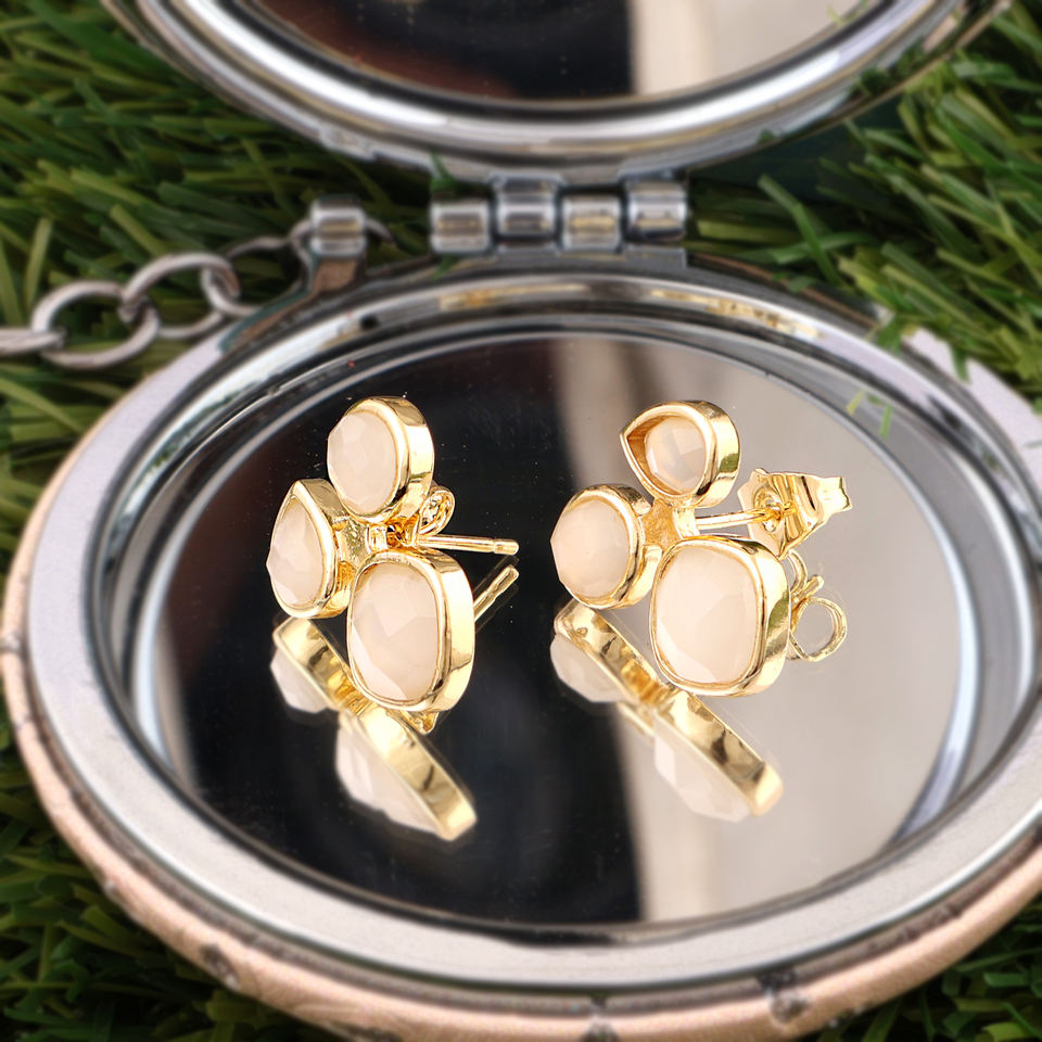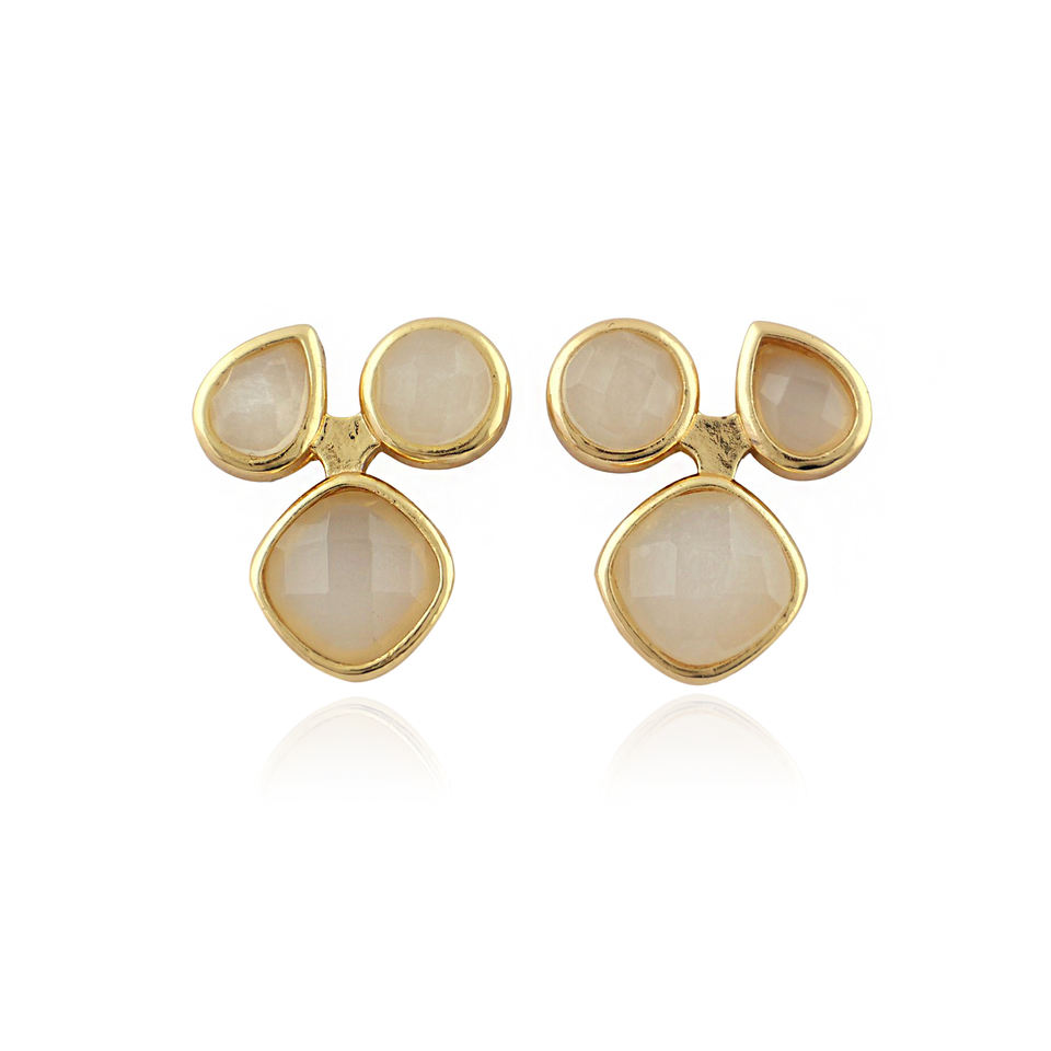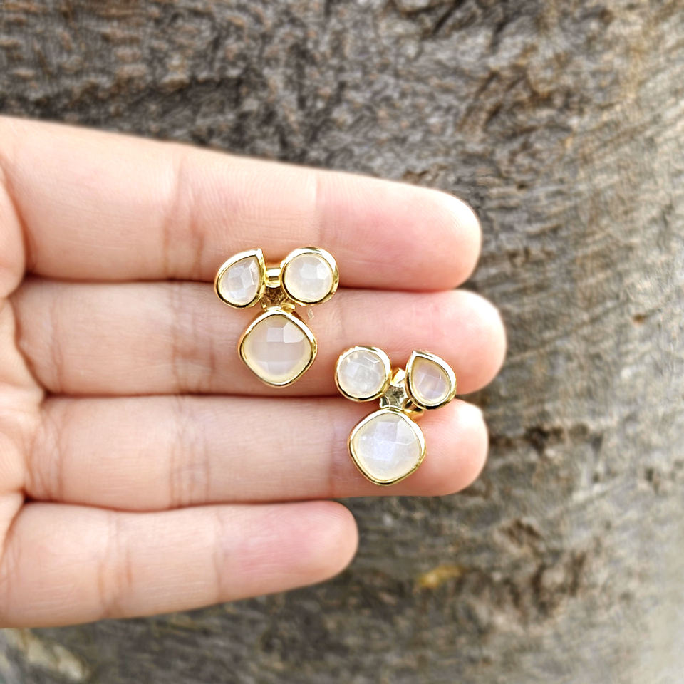 Minimalist Triple White Moonstone Checker Cut Stone Stud Earrings Solid Brass 18k Gold Plated Trendy Wedding Gift Jewelry