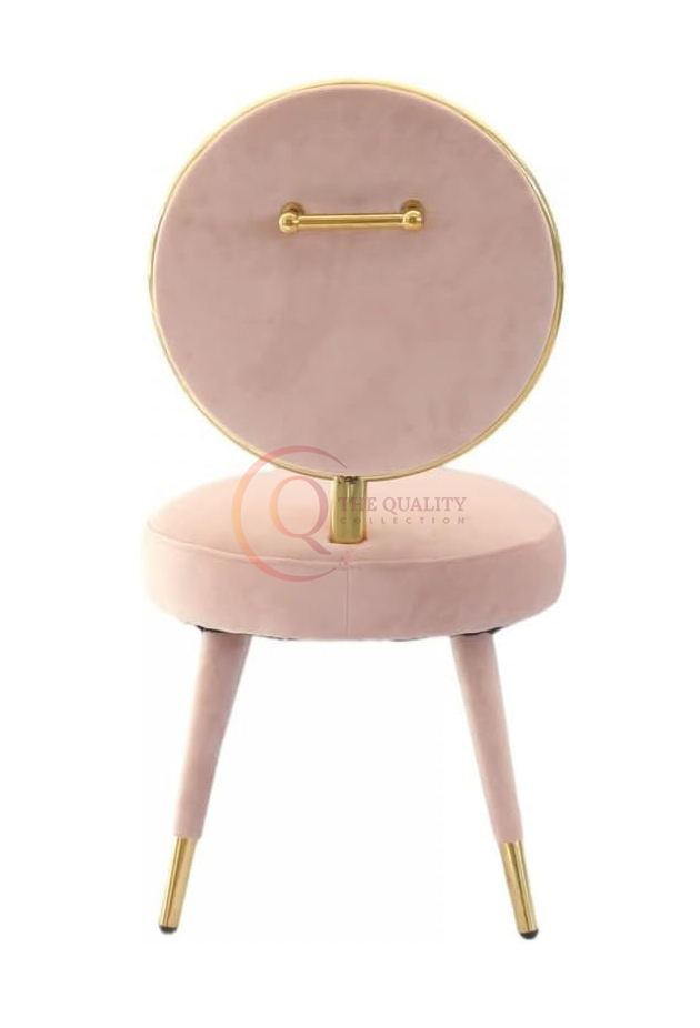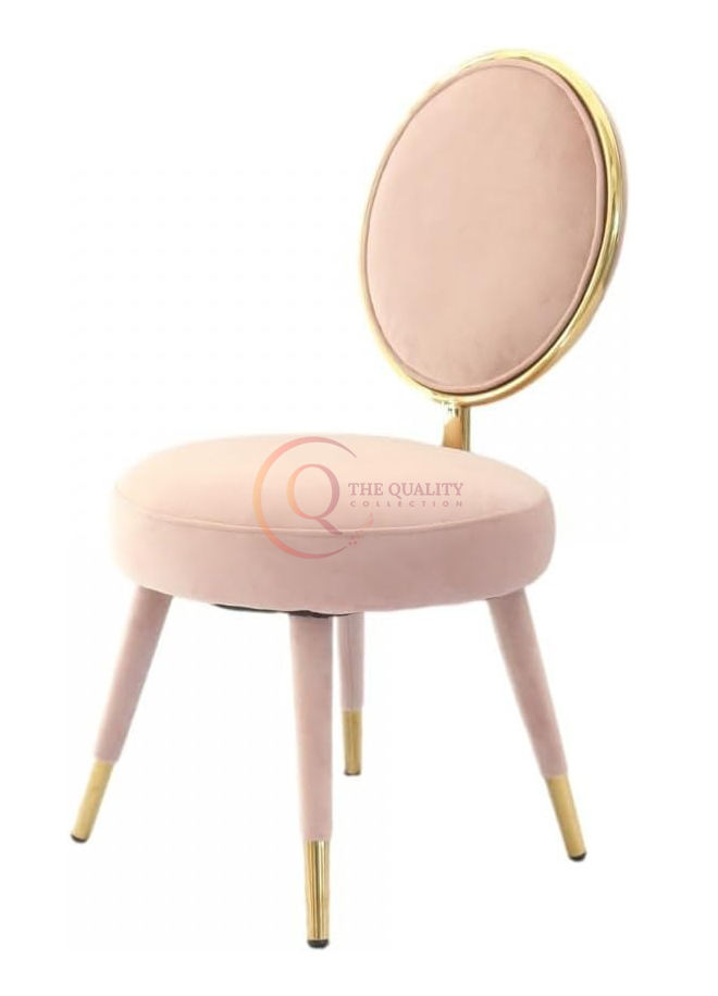 เก้าอี้สีชมพูหรูหราเรียบง่ายพร้อมพนักพิงทรงกลมกรอบสีทองและขาเรียวเพิ่มสัมผัสของความมีเสน่ห์และความสง่างาม