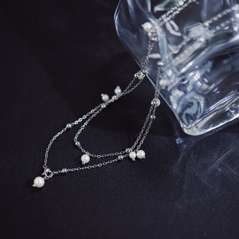 สร้อยคอเงินประดับมุกเทียมสแตนเลสดีไซน์เรียบง่าย พร้อมลูกปัดเหล็กสองชั้นและสร้อยคอมุกสำหรับผู้หญิง