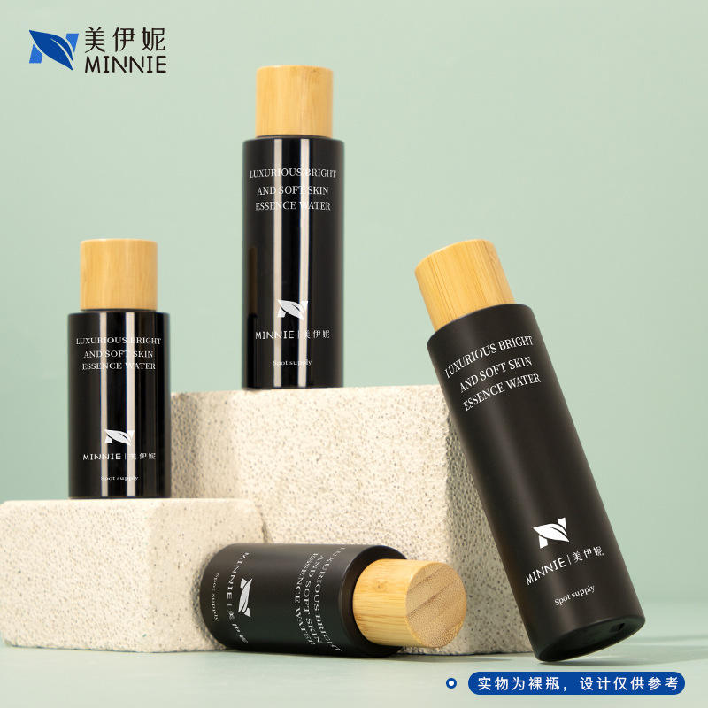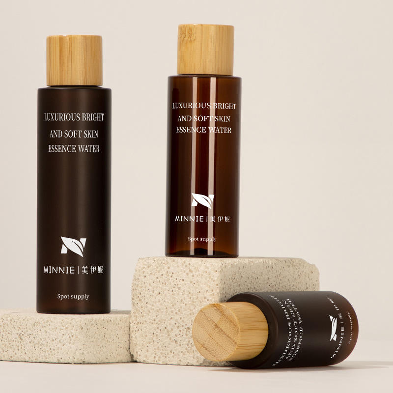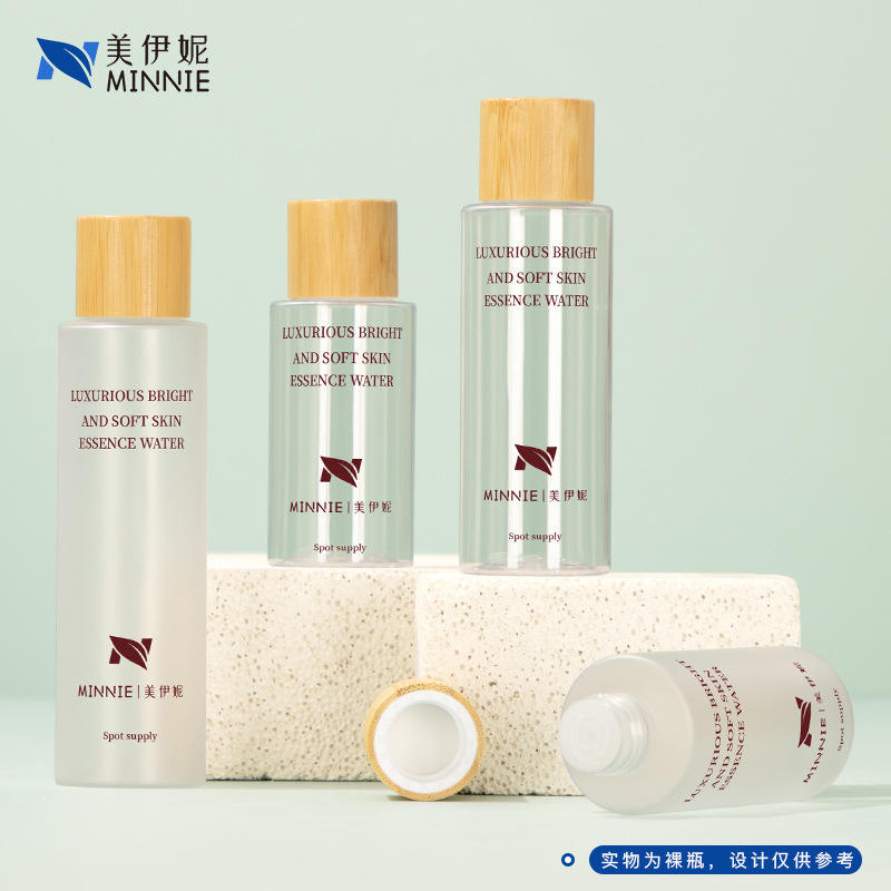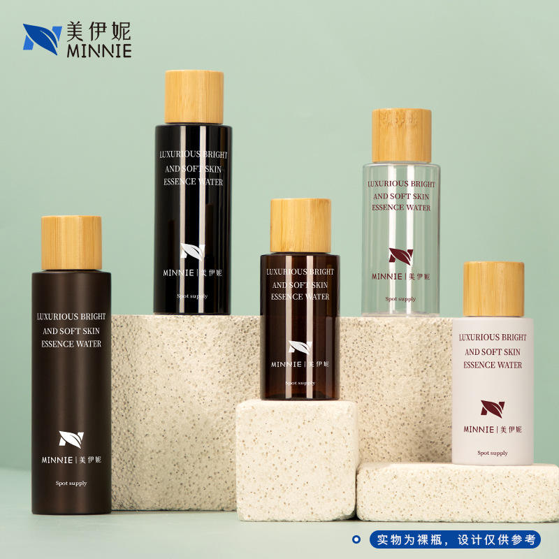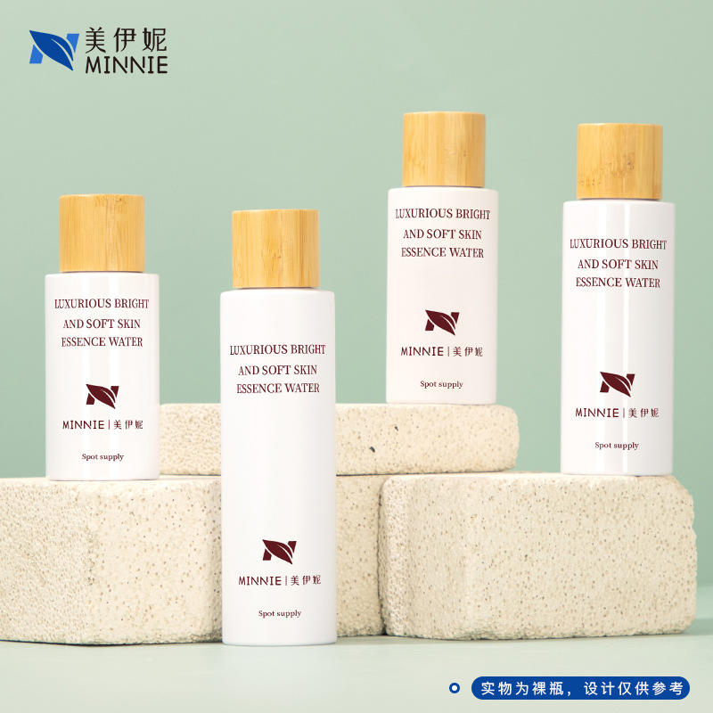 มินนี่ ลักชัวรีส์ ไบรท์ แอนด์ ซอฟท์ สกิน เอสเซนส์ วอเตอร์ 100 มล. 120 มล. 150 มล. 200 มล. ขวดรีฟิลฝาไม้ไผ่สำหรับบรรจุภัณฑ์เครื่องสำอาง