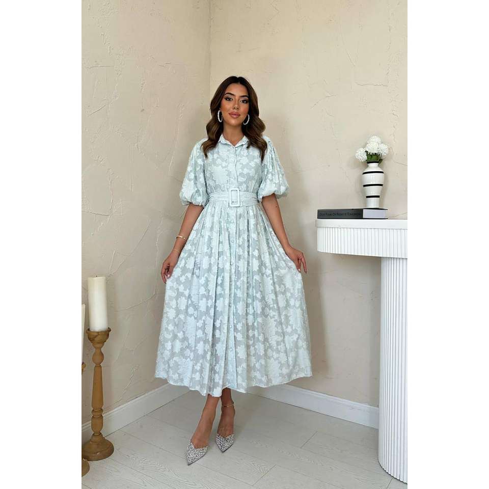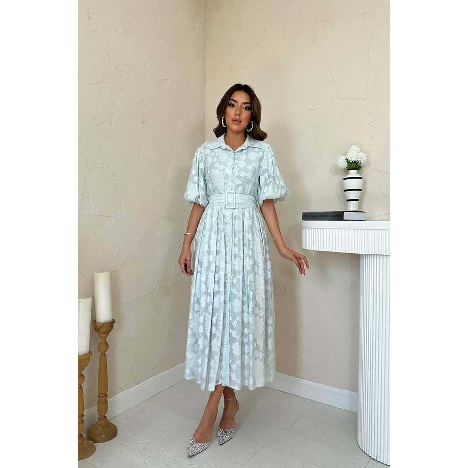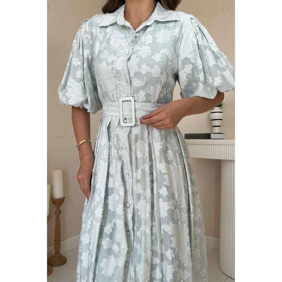 เดรสทรงเอ คอปกพับ แขนบอลลูนผูกโบว์ ผ้าทอลายวินเทจ ระบายอากาศได้ดี สวมใส่สบายๆ ทุกวัน