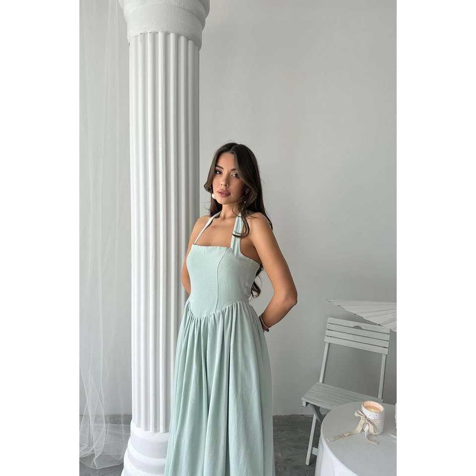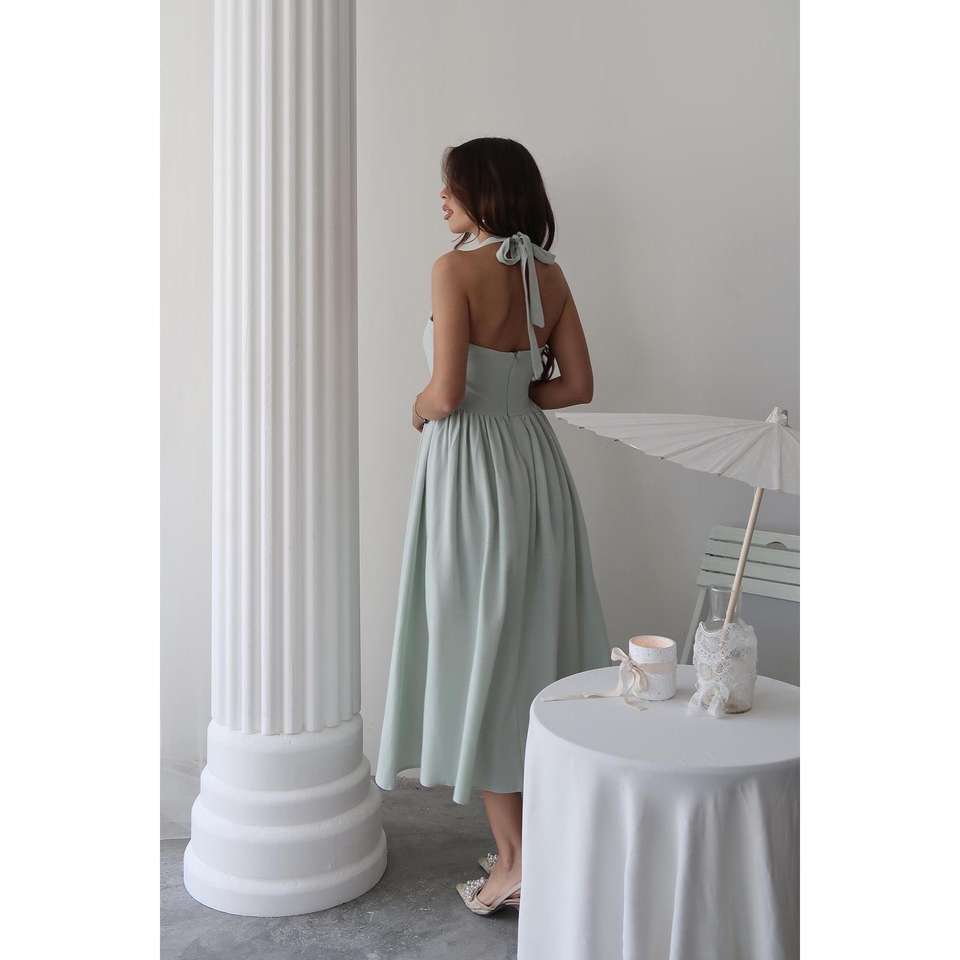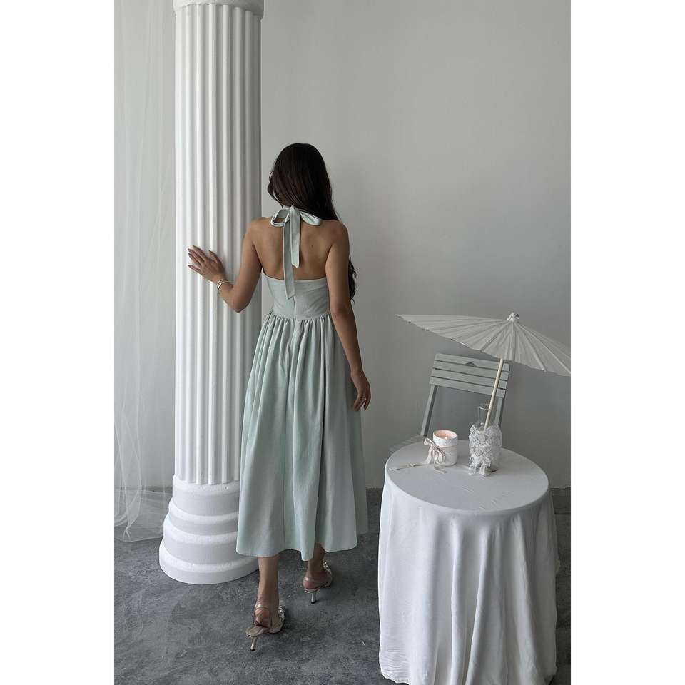 เดรสผ้าลินินคอ halter สีเขียวมิ้นท์ ทรงเอ เอวธรรมชาติ ระบายอากาศได้ดี สวมใส่สบายๆ