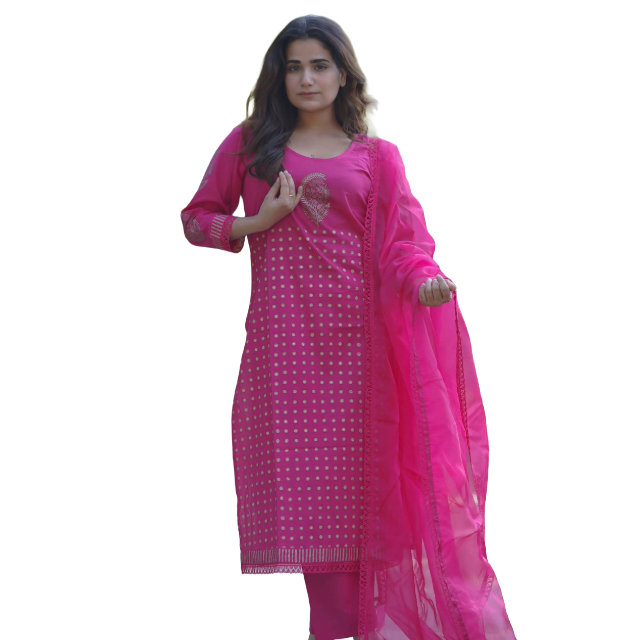 ชุดสูทผ้าฝ้ายพิมพ์ลายทอง Mira Fuchsia Radiance พร้อมผ้าคลุมไหล่ผ้าออร์แกนซ่า ราคาสุดคุ้ม
