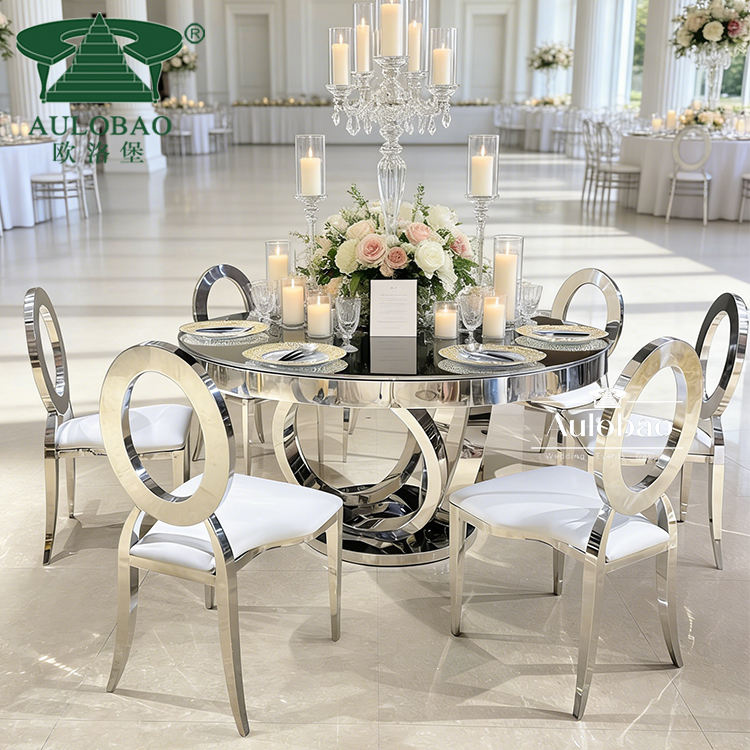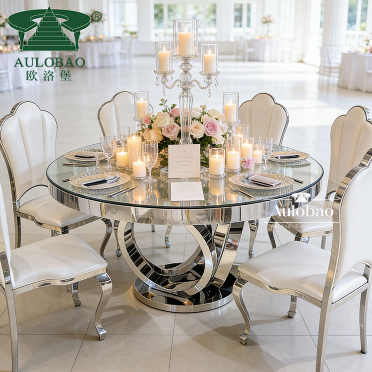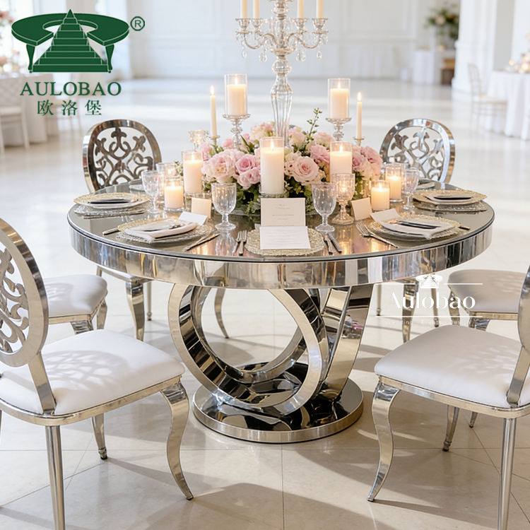 โต๊ะกลมขนาดใหญ่หน้ากระจกเงา ฐานสแตนเลสสีเงิน สำหรับงานแต่งงาน