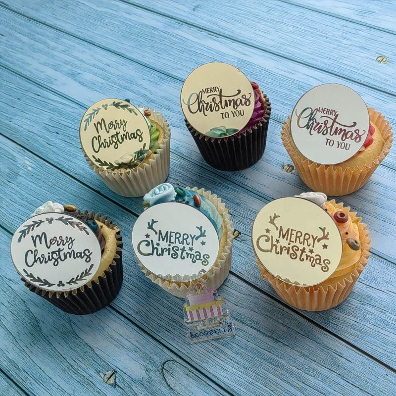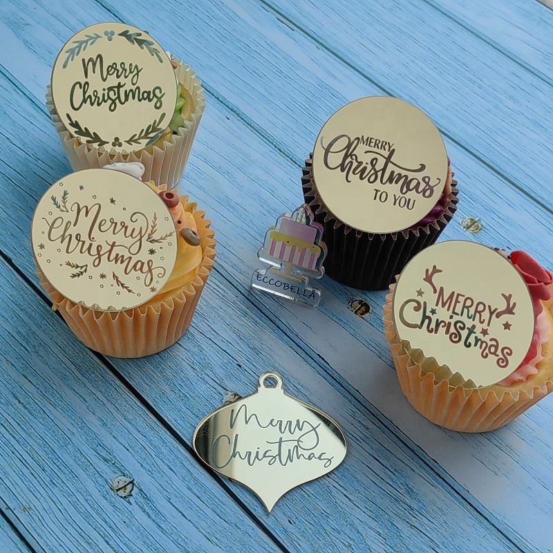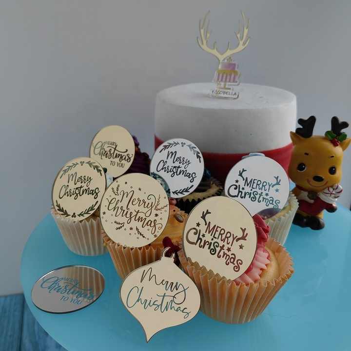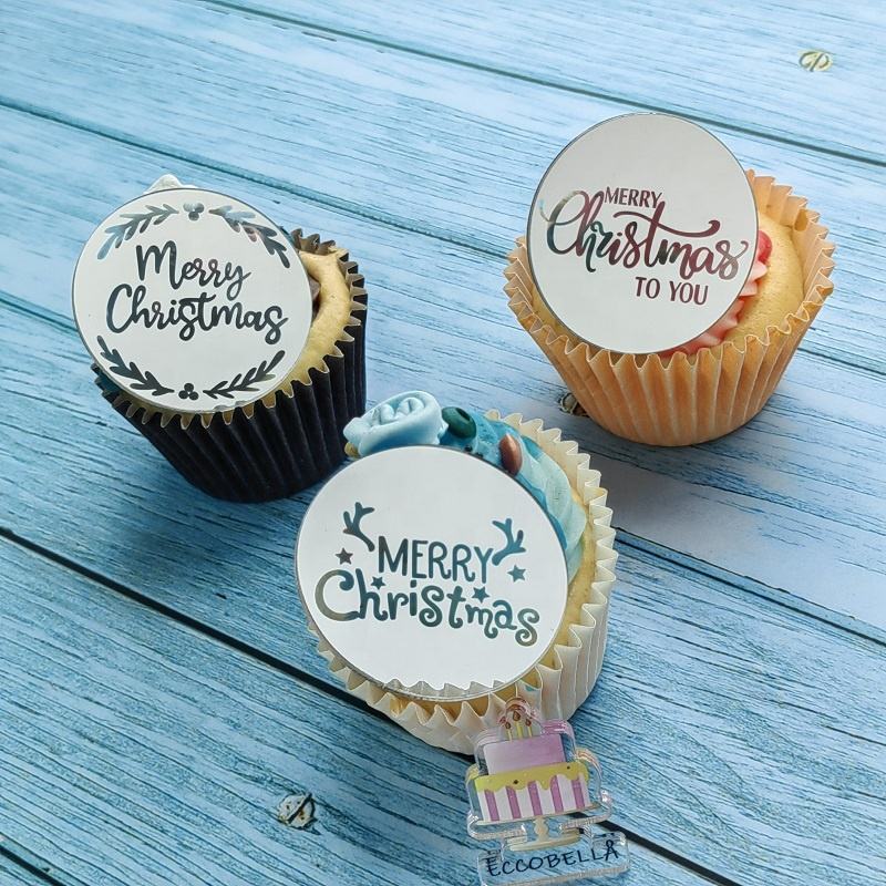 ท็อปเปอร์คัพเค้กอะคริลิคสีทองเงินลายพิมพ์ UV เป็นมิตรกับสิ่งแวดล้อม ใช้ซ้ำได้ สำหรับตกแต่งเค้กในงานปาร์ตี้คริสต์มาส