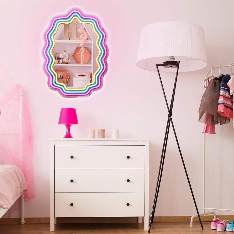 กระจกไฟ LED ป้ายนีออนสีรุ้งสำหรับตกแต่งห้องนอนเด็กผู้หญิงกระจกนีออนน่ารัก