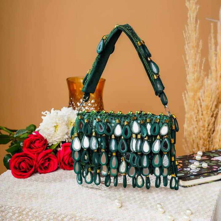 กระเป๋าคลัทช์สำหรับตอนเย็นประดับด้วยเพชรประดับกระจกงานปักสไตล์โบฮีเมียนงานแฮนด์เมดสำหรับงานแต่งงานของเจ้าสาวในอินเดีย