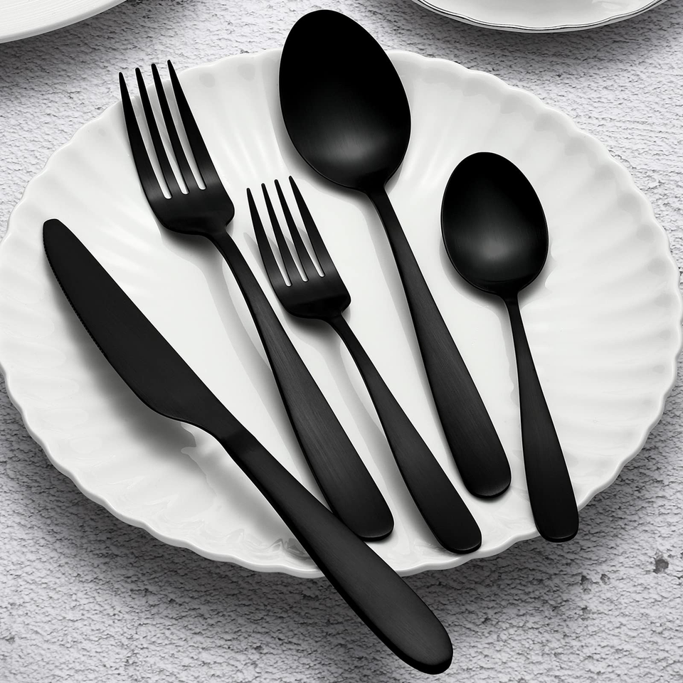 ชุดอุปกรณ์ทานอาหารเหล็กกระจกสำหรับบ้านโรงแรมชุดเสิร์ฟอาหารเย็นโลหะสีดำ100% สินค้าแฮนด์เมดคุณภาพสูง
