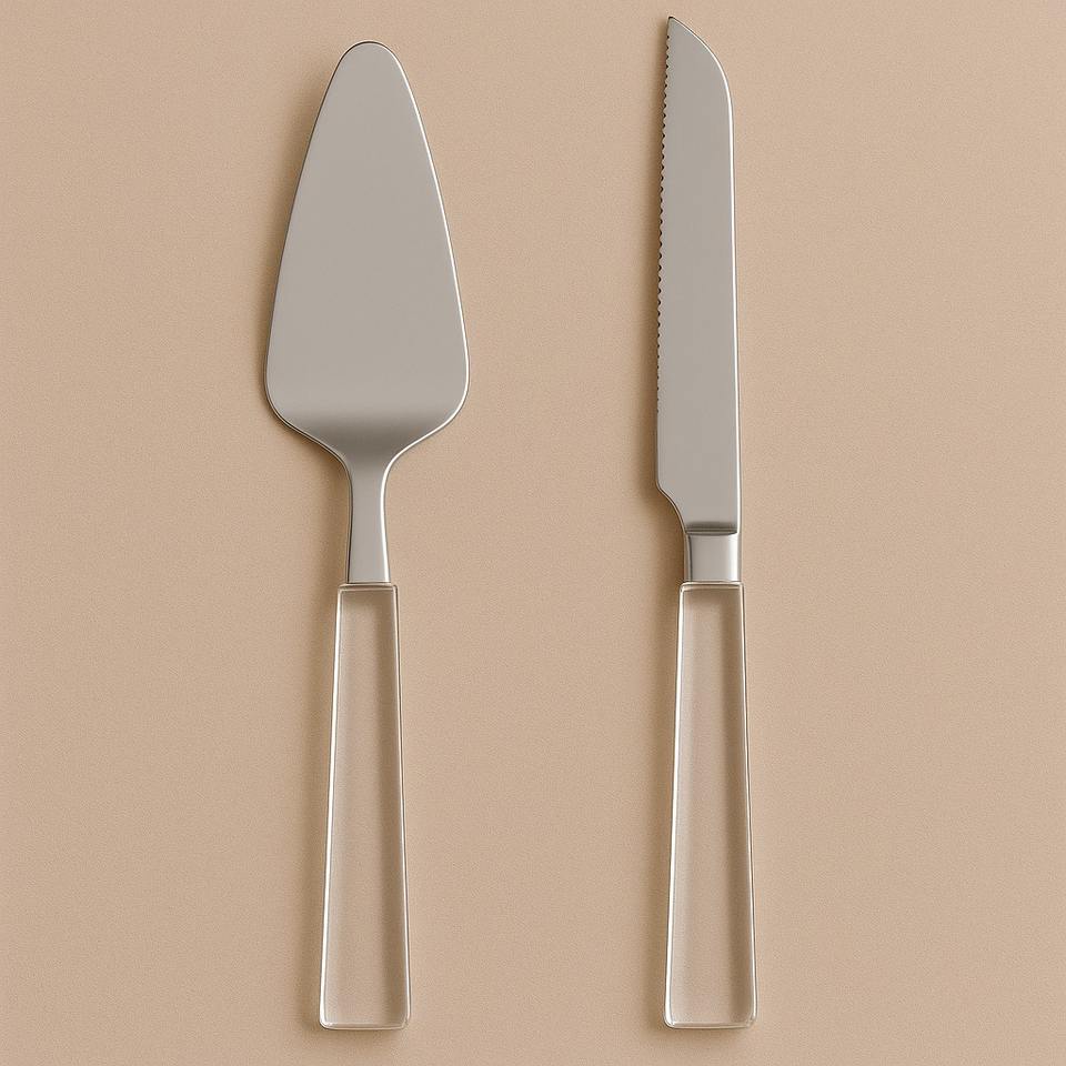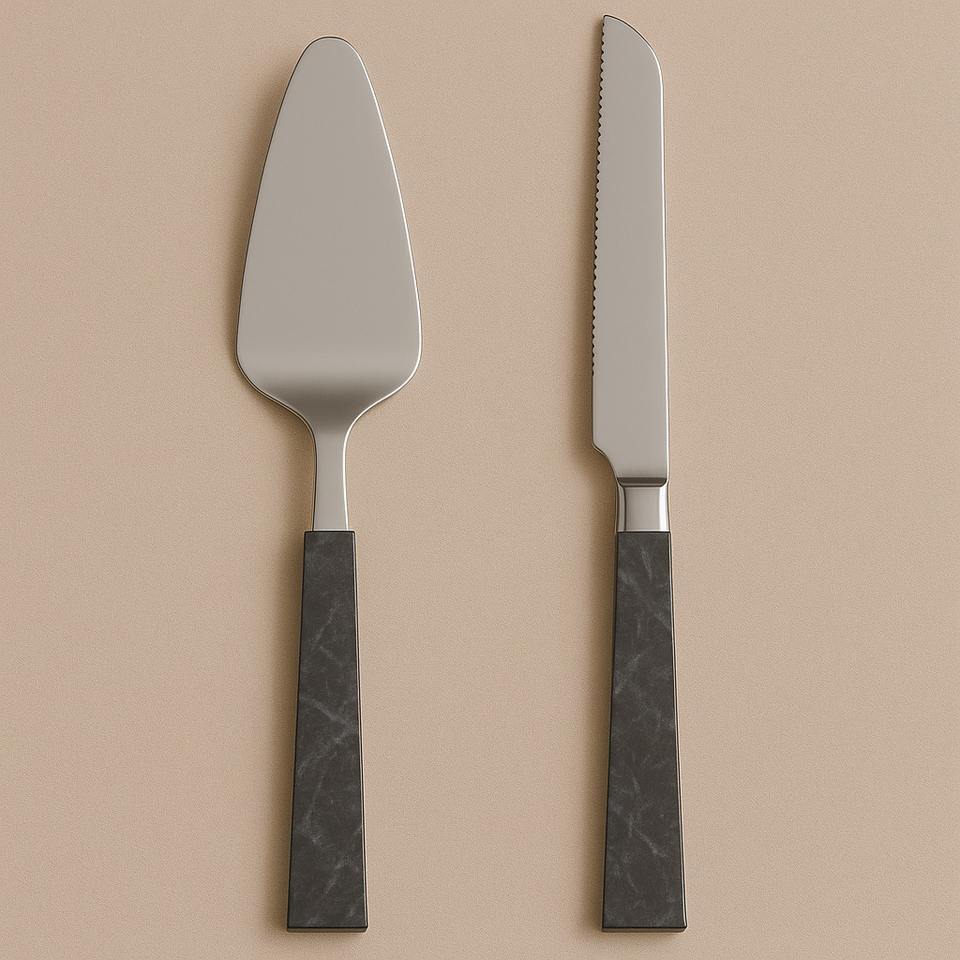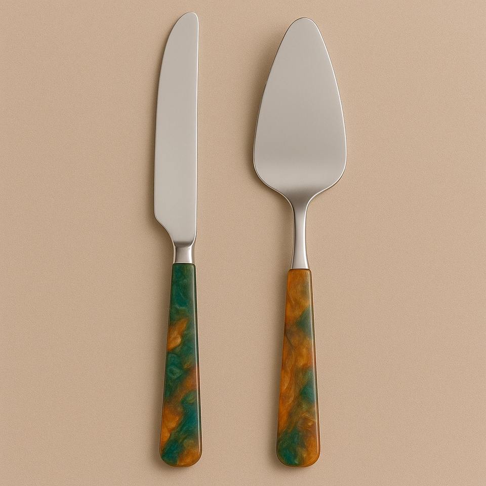 ชุดมีดตัดเค้กทำจากเหล็กมิเรอร์พร้อมด้ามจับทำจากเรซินหินอ่อนสีเบจสำหรับเสิร์ฟของหวานในวันแต่งงานวันเกิด