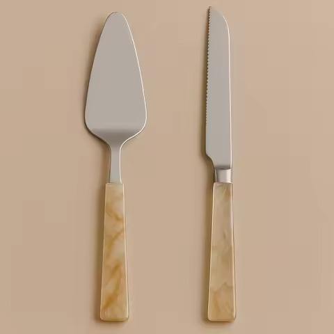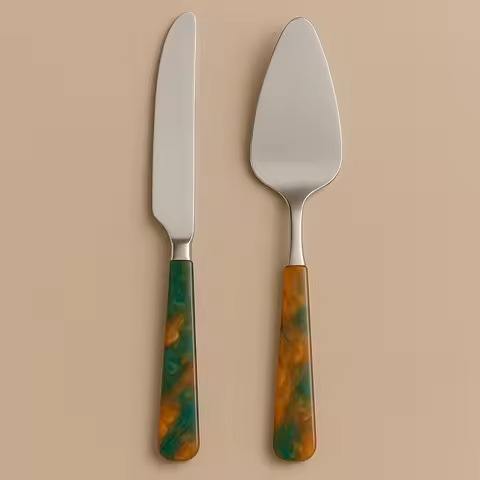 ชุดมีดตัดเค้กและที่เสิร์ฟทำจากเหล็กขัดเงา พร้อมด้ามจับเรซิ่นลายวนสีเขียวอำพัน ดีไซน์ทันสมัย เหมาะสำหรับงานเลี้ยงฉลองแต่งงาน