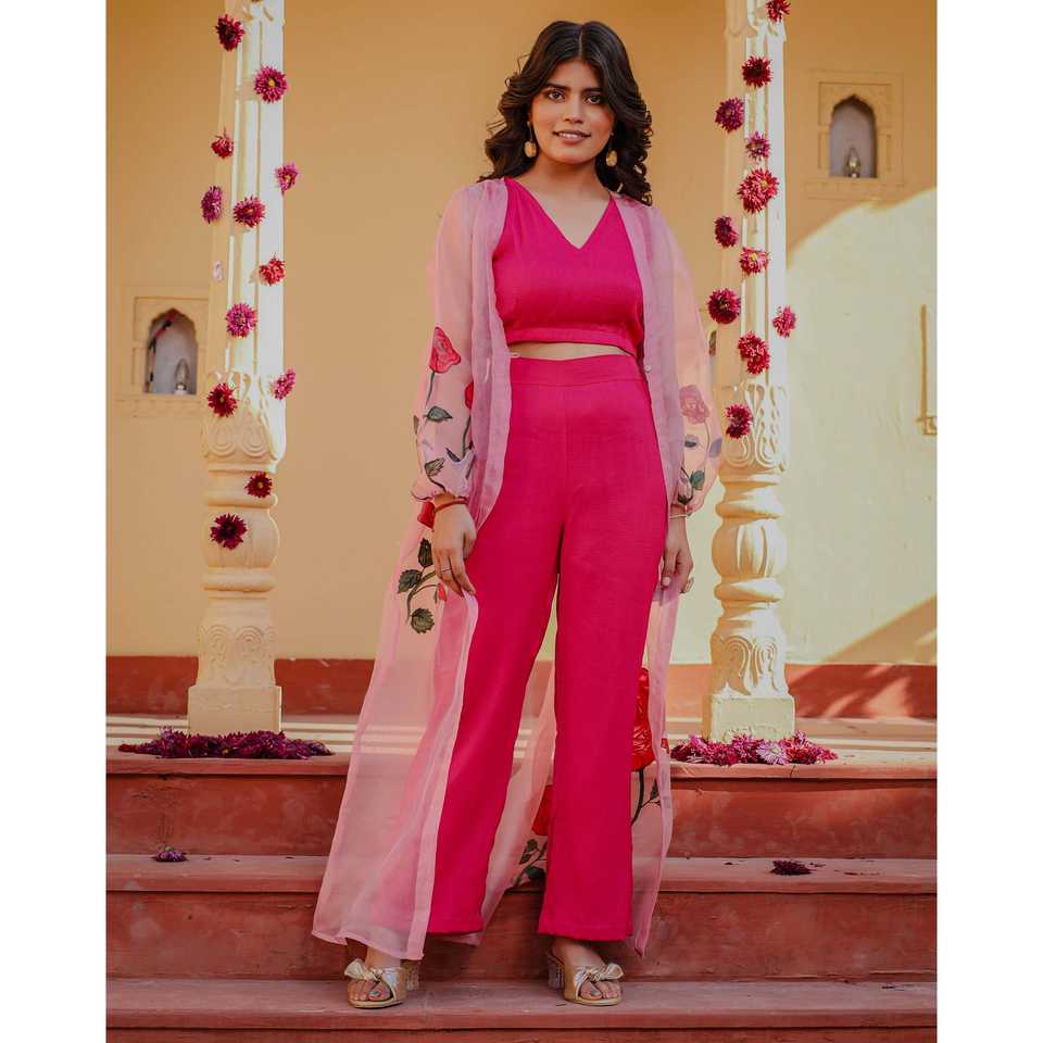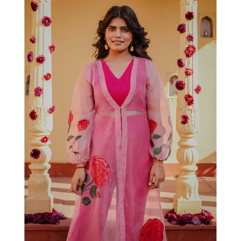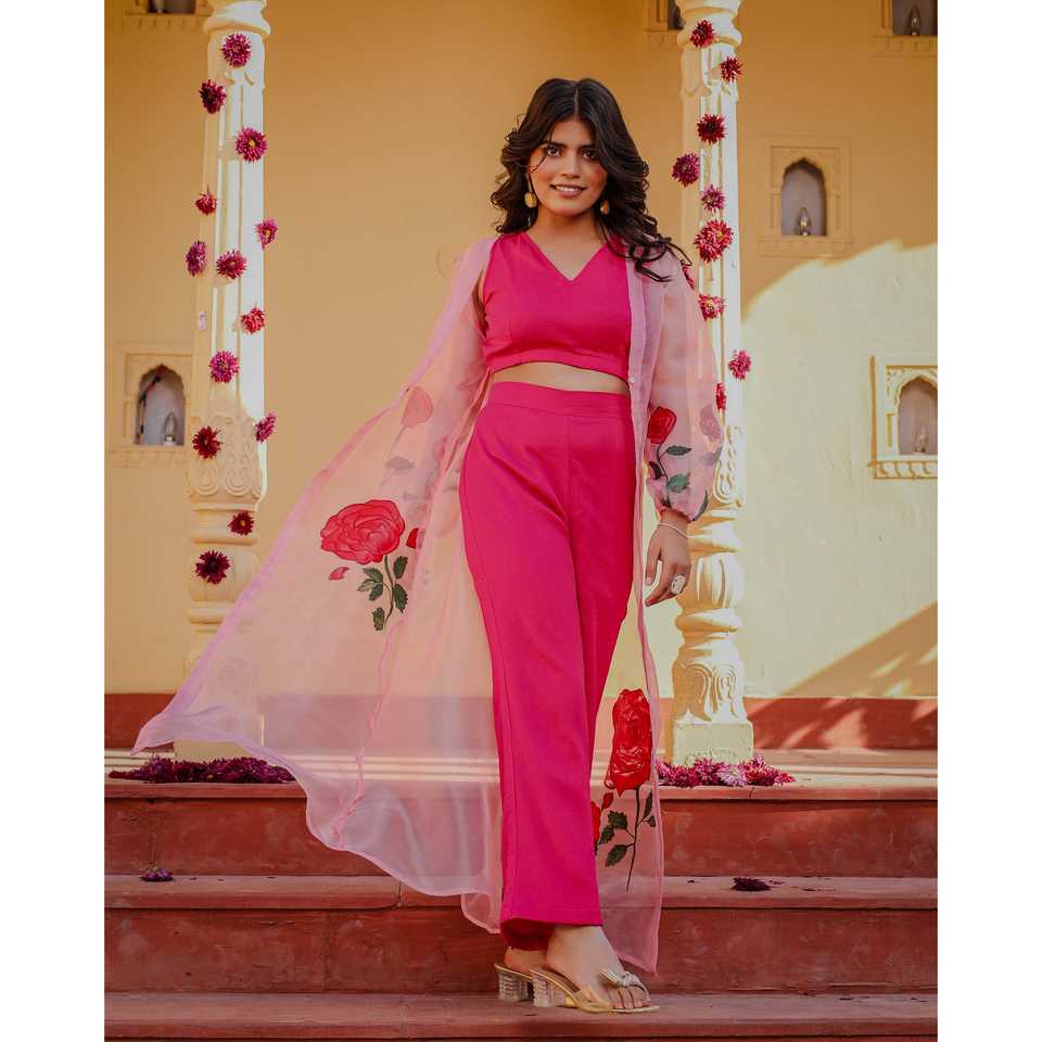 ชุดมิชิกะ XS สีชมพูโรส ลายเพ้นท์มือ 3 ชิ้น ผ้าชีฟอง แบบเสื้อท่อนบน