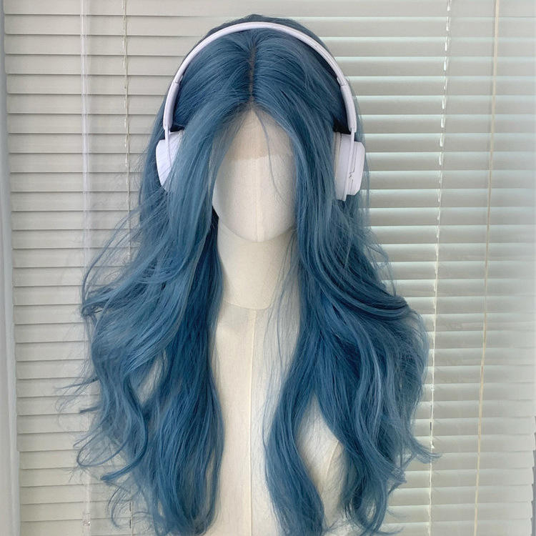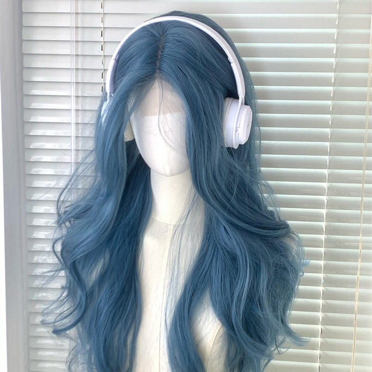 วิกผมยาวหยิกสีฟ้าหม่นพร้อมหน้าม้าปัดข้าง 55 ซม. เส้นใยคาเนคาลอน แนวผมธรรมชาติ ลูกไม้โปร่งใสสำหรับผู้หญิง