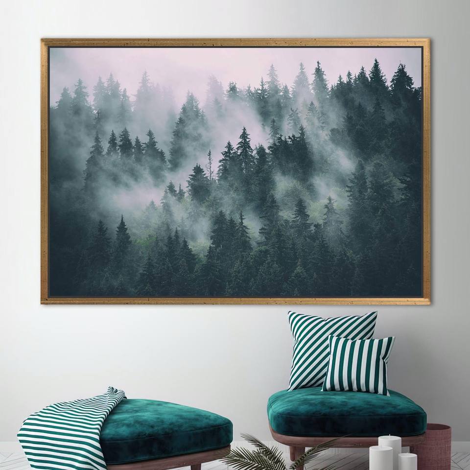 ศิลปะบนผืนผ้าใบพิมพ์ลายภูเขาหมอก - ของตกแต่งผนังลายวิวป่าอันงดงาม,1P:กรอบสีทอง