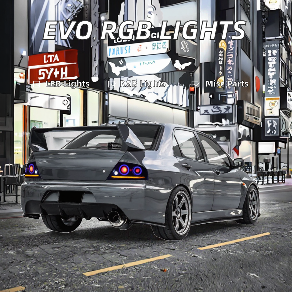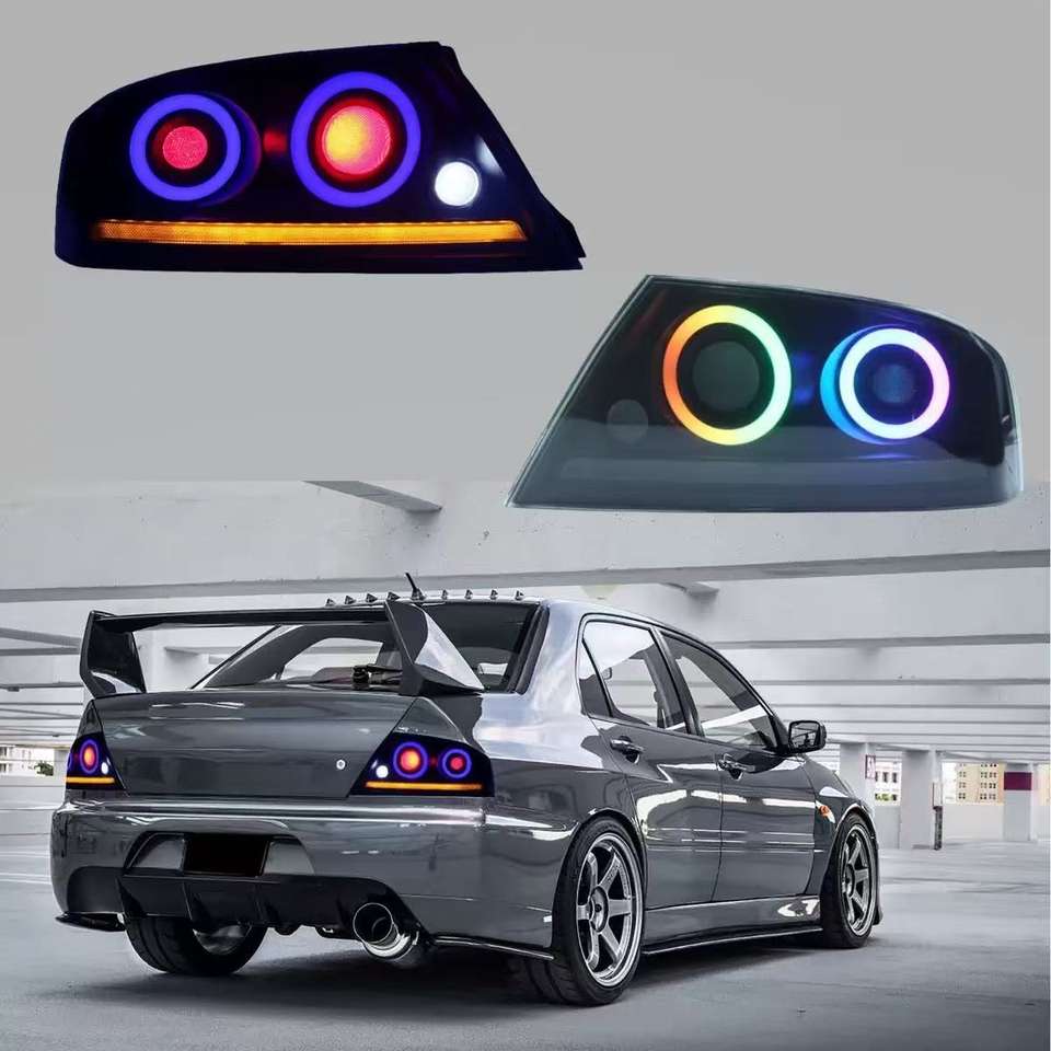 ไฟท้าย LED RGB สำหรับรถยนต์มิตซูบิชิ แลนเซอร์ อีโวลูชั่น EX/EVO JDM ปี 2001-2007 อะไหล่กันชนหลังใหม่ 12V 6000K เลนส์สีรมควัน รุ่นที่ 7 และ 9