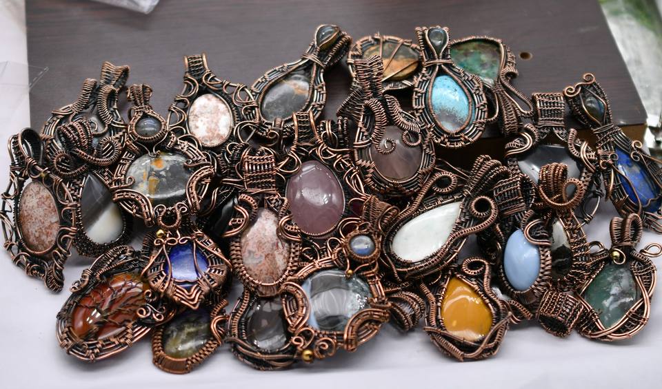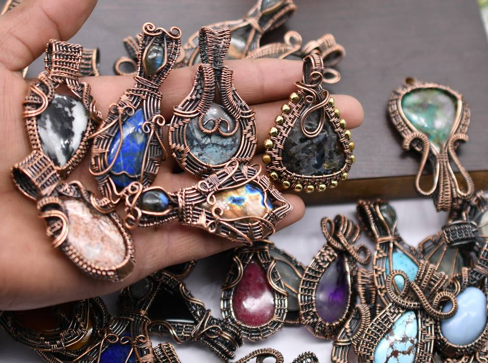 จี้ห้อยคอทำมือประดับด้วยอัญมณีหลากชนิดพันด้วยลวดทองแดง