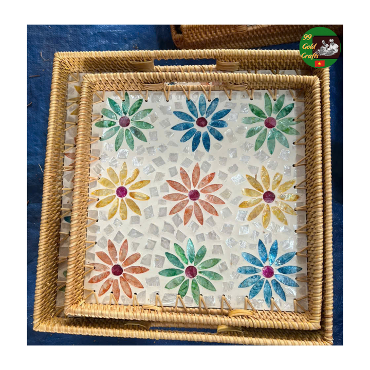 ถาดเสิร์ฟโมเสกหวายผสมมุก งานฝีมือทำมือ สำหรับตกแต่งบ้านและร้านขายของที่ระลึก ถาดโมเสกหวายสาน
