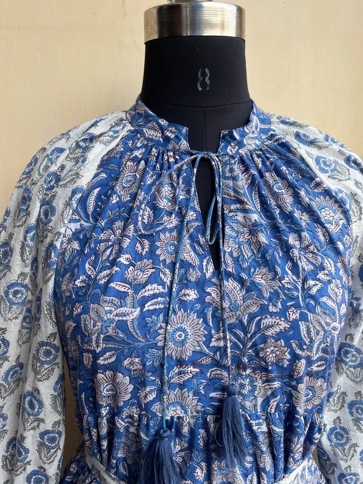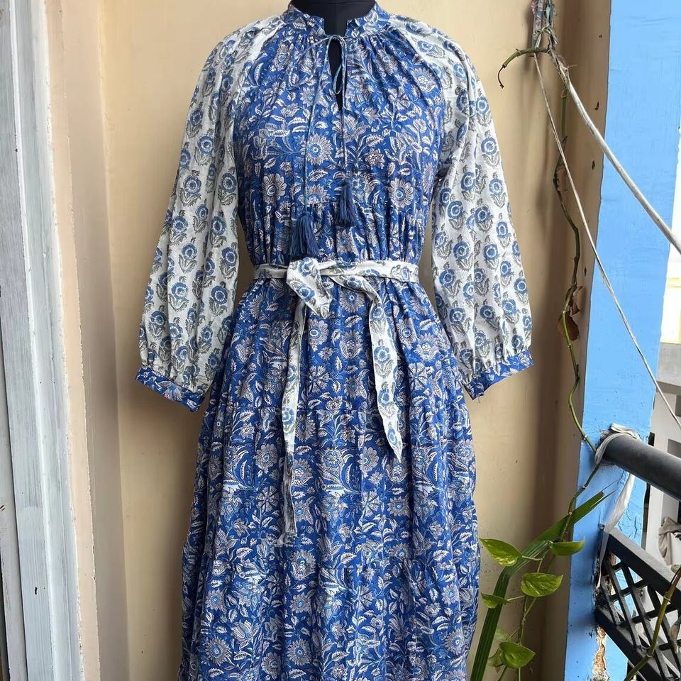 เดรสยาวผ้าฝ้ายพิมพ์ลายบล็อกขายดีปี 2026 เดรสลำลองแบบยาวทรงหลายชั้น มีกระเป๋า ราคาโรงงาน