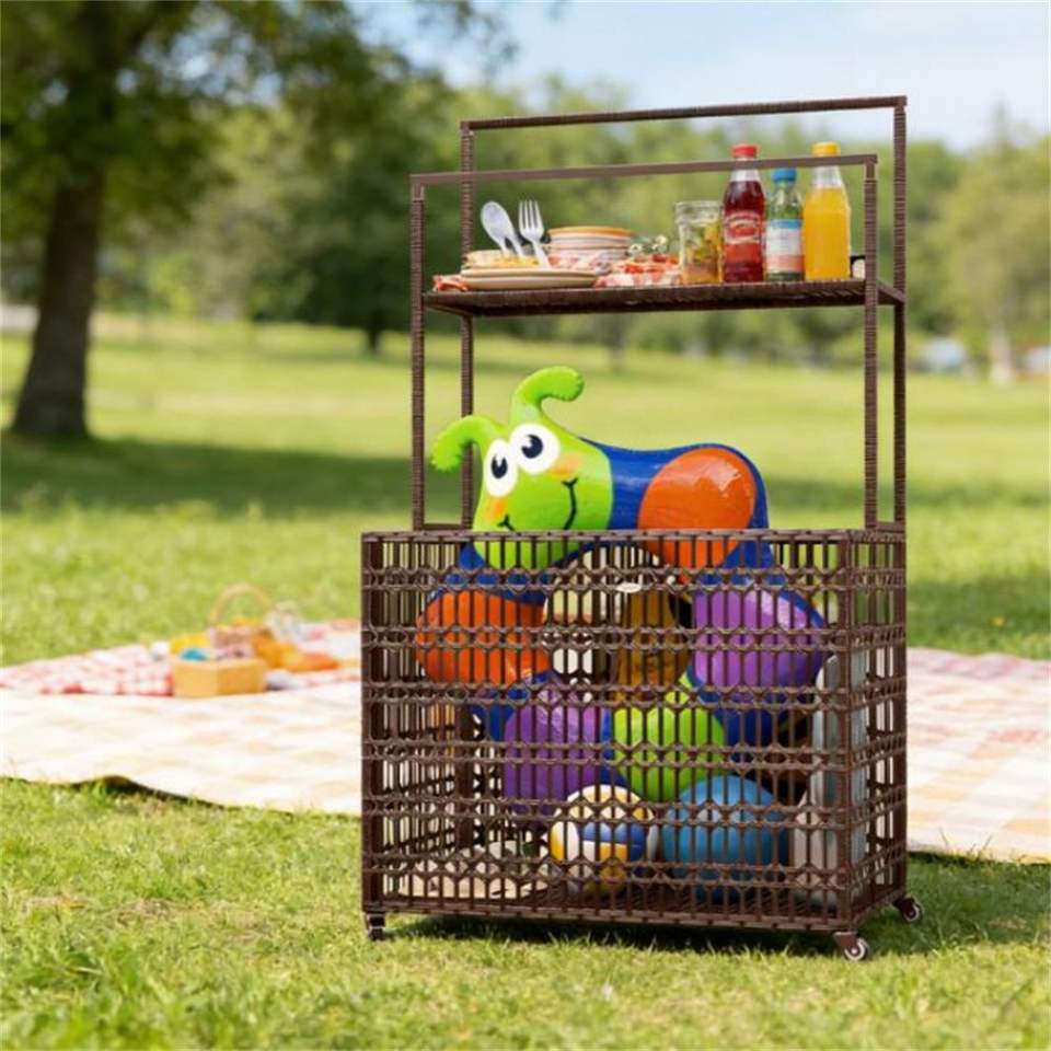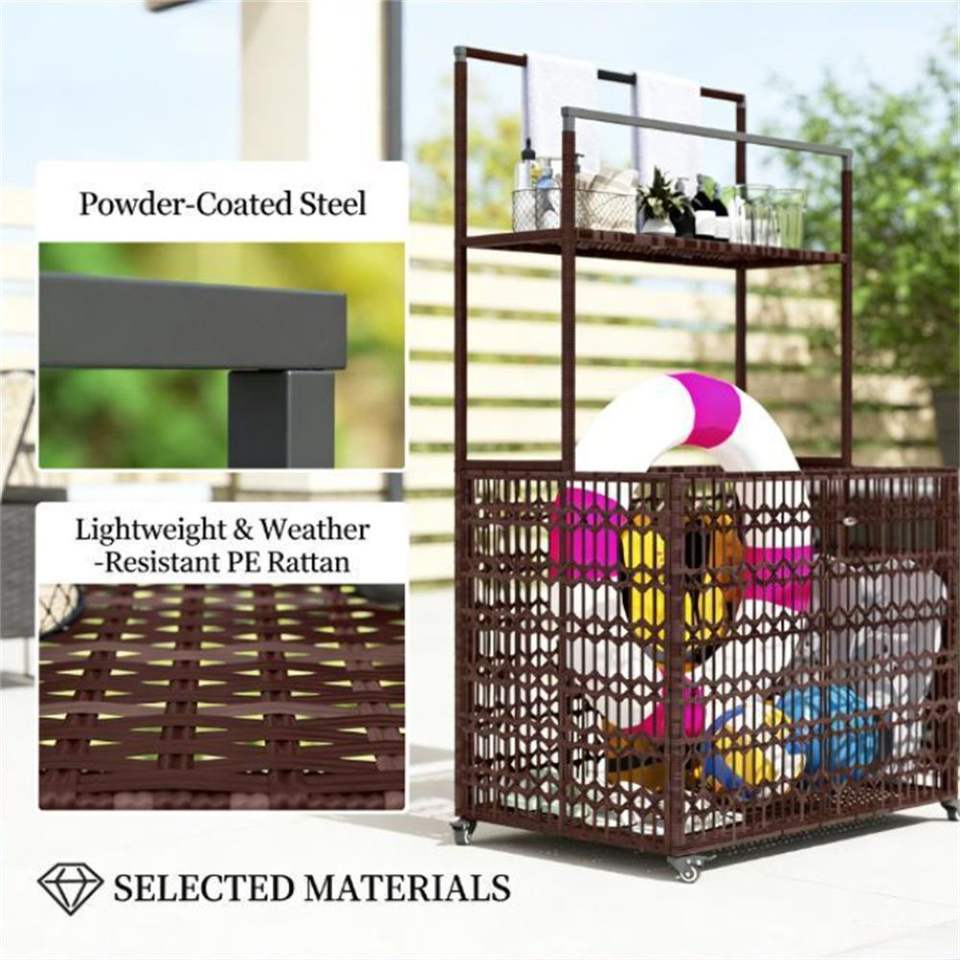 ตู้เก็บของสีน้ำตาลผสมพร้อมราวแขวนผ้า ชั้นวางของกลางแจ้ง ชั้นวางของสำหรับสระว่ายน้ำ
