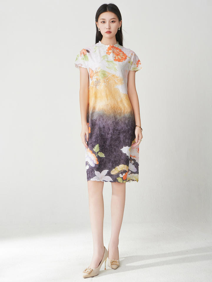 Miyake เดรสผู้หญิงยาวปานกลางพิมพ์ลายดีไซน์แฟชั่น2025