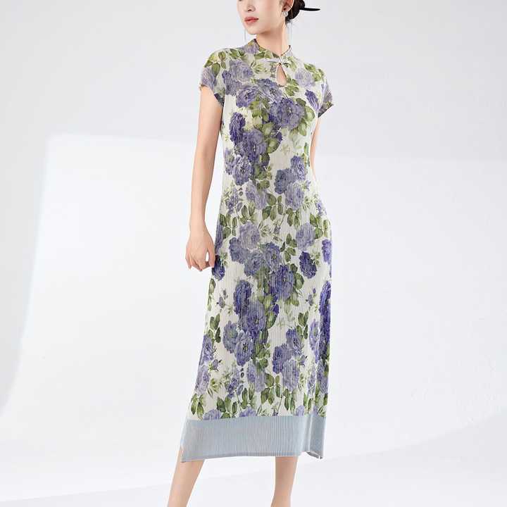 Miyake เดรสมิดิผ้าทอสไตล์วินเทจของผู้หญิง, เดรสมิดิแขนสั้นระบายอากาศเอวธรรมชาติฤดูร้อนเป็นมิตรกับสิ่งแวดล้อมพิมพ์ลายจีนย้อนยุค
