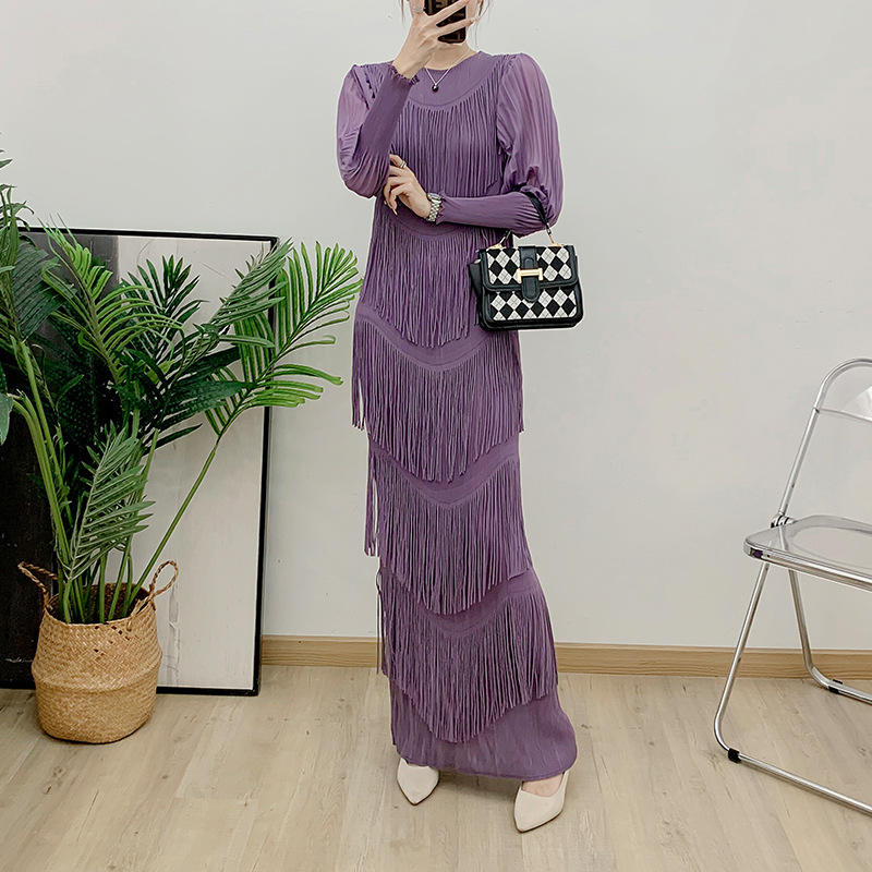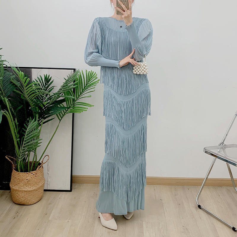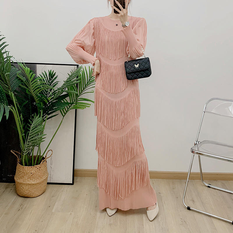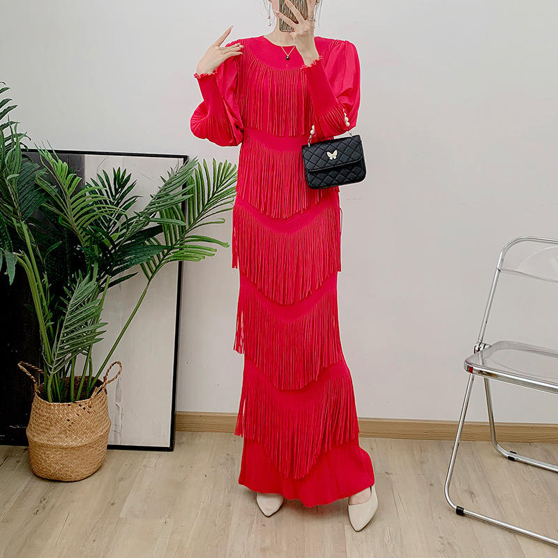 ชุดเดรสลำลองยาวถึงพื้นสำหรับผู้หญิง รุ่น Miyake คอลเลคชั่นฤดูใบไม้ร่วง ปี 2024 ดีไซน์ใหม่ แต่งระบายพู่ ตัดต่อผ้า ทรงเอวธรรมชาติ แขนทรงโคมไฟ
