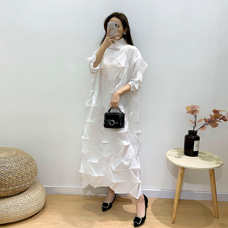 ชุดเดรสพลีททรงเอไลน์ แบรนด์มิยาเกะ ผ้าโพลีเอสเตอร์ 100% ทรงเอไลน์ แขนสั้น เอวธรรมชาติ สไตล์ลำลองสำหรับผู้หญิง ใส่สบายในฤดูร้อน