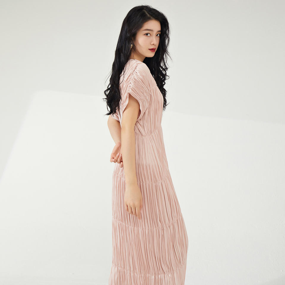 Miyake ชุดเดรสฤดูร้อนสำหรับผู้หญิง, 2024ระดับไฮเอนด์คอกลมแขนสั้นดีไซน์แบบอัดพลีท100% โพลีเอสเตอร์กันรอยยับ