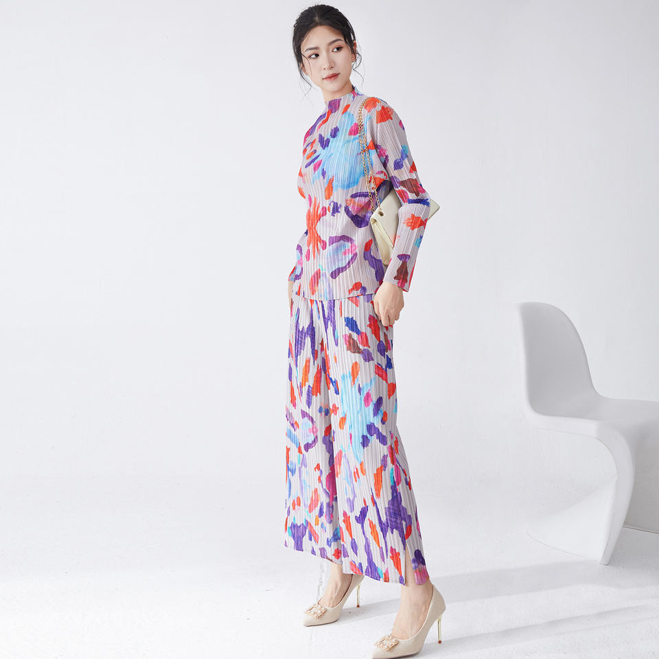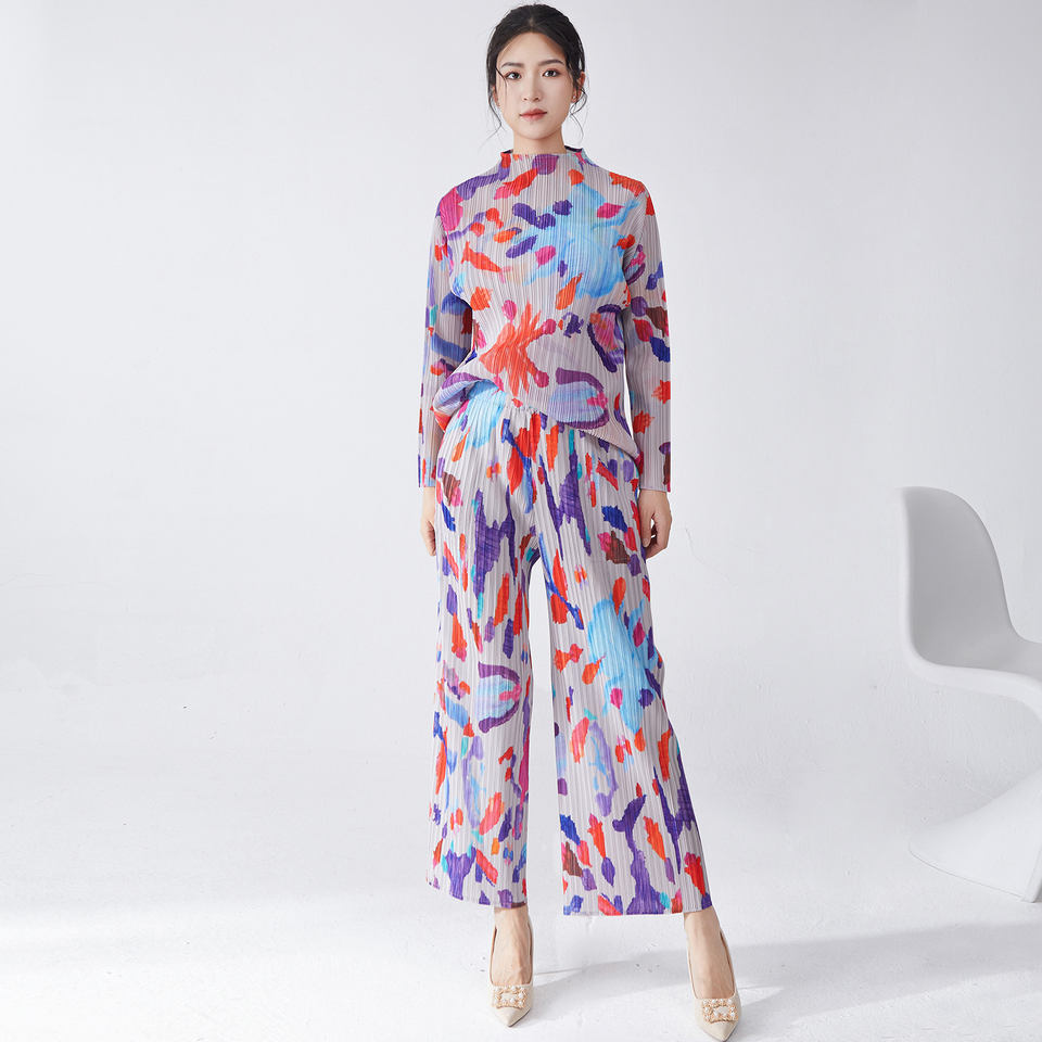 ชุดลำลองสองชิ้นสำหรับผู้หญิง Miyake รุ่นใหม่ปี 2025 เสื้อยืดแขนยาวพิมพ์ลาย & กางเกงขายาวทรงตรง ชุดเดียว ผ้าโพลีเอสเตอร์ 100%