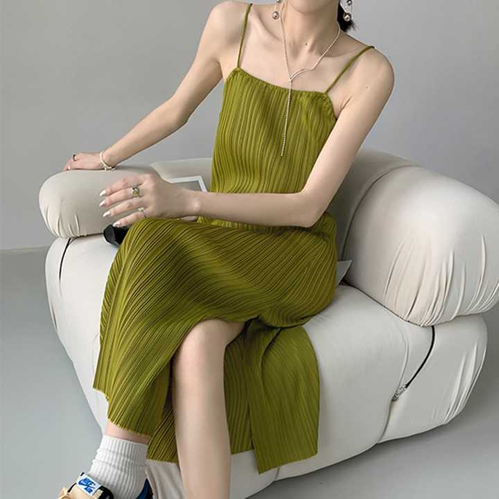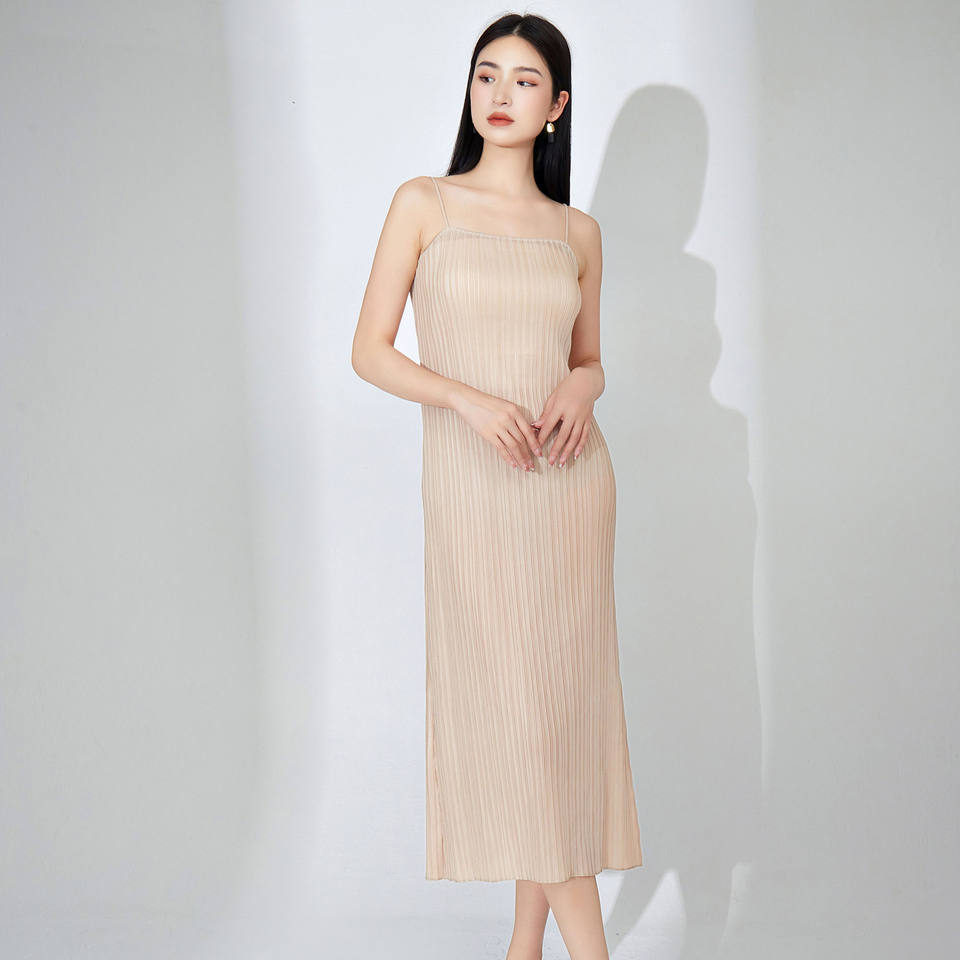 Miyake ชุดเดรสผู้หญิงแขนกุดยาวปานกลางมีจีบยืดหยุ่น